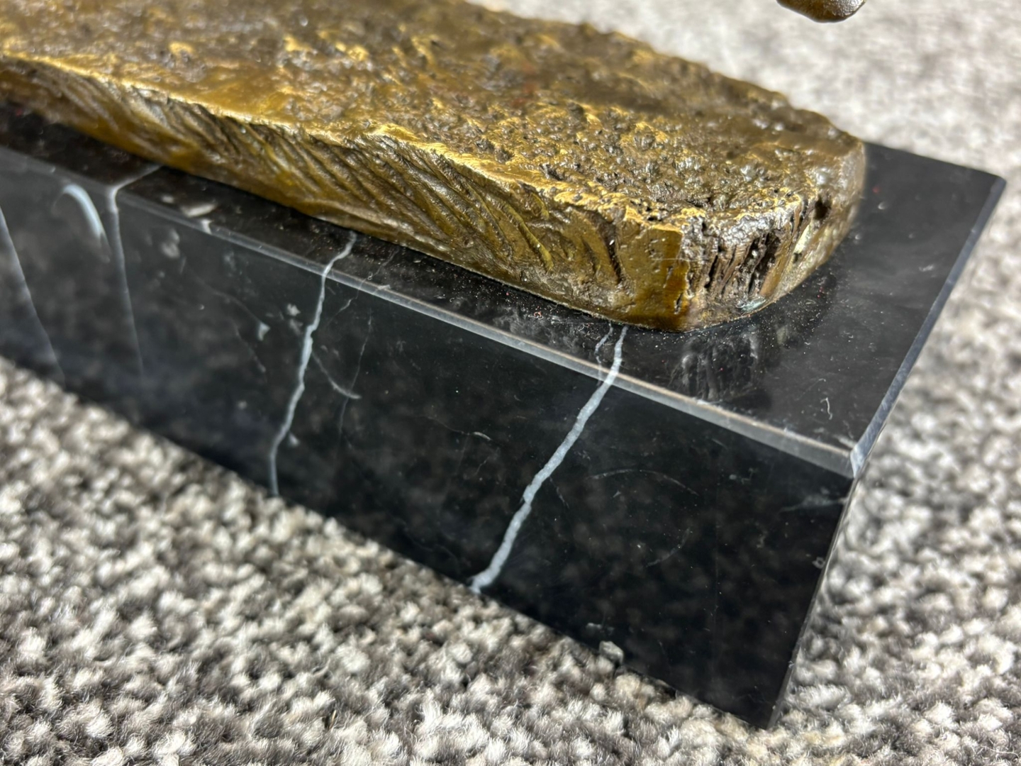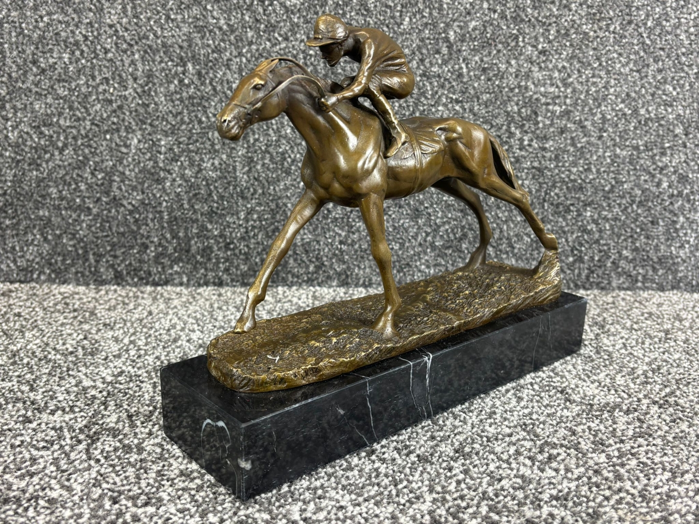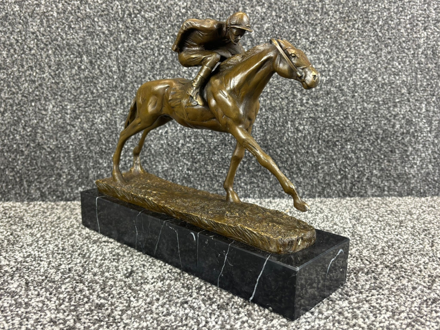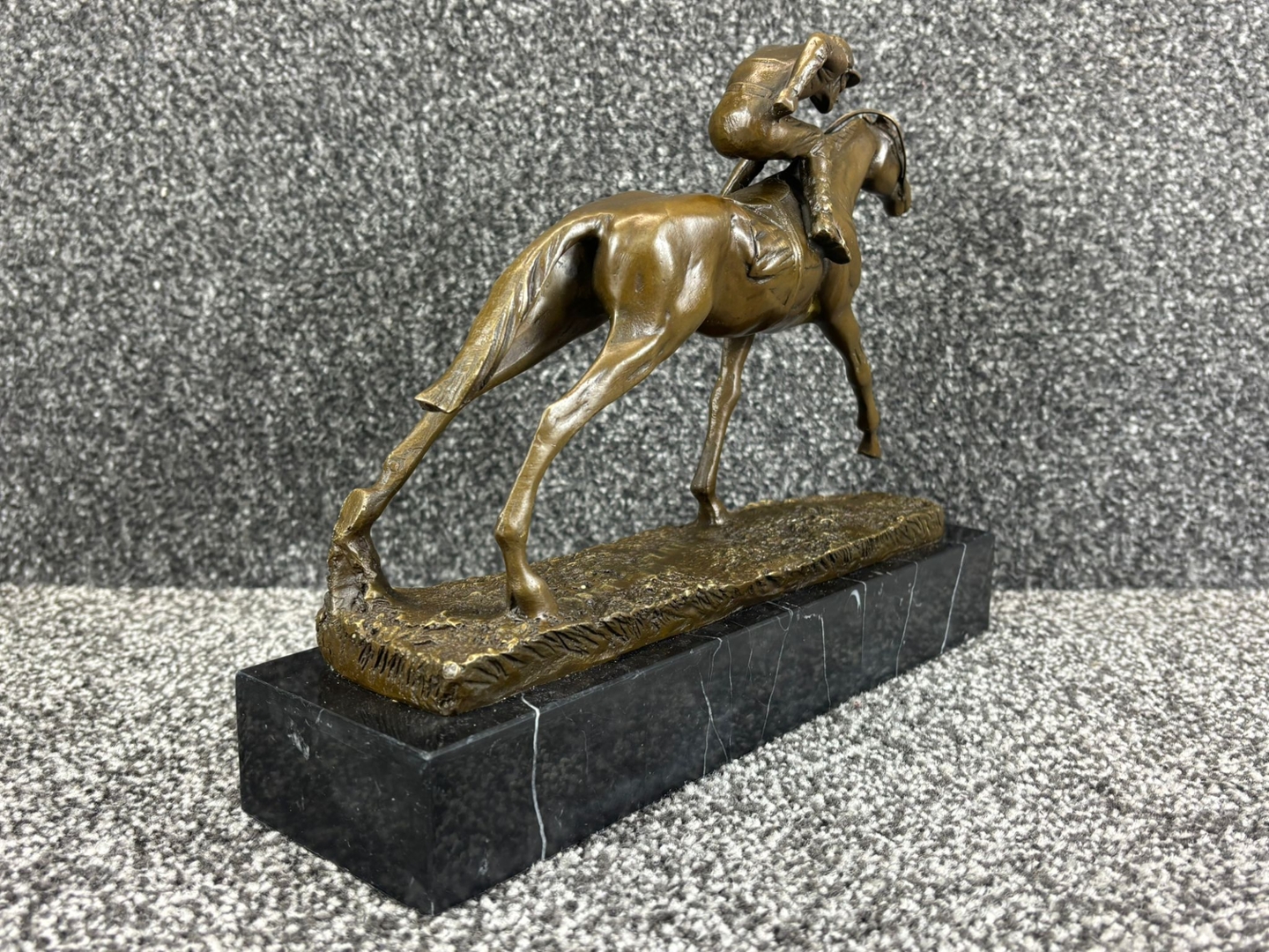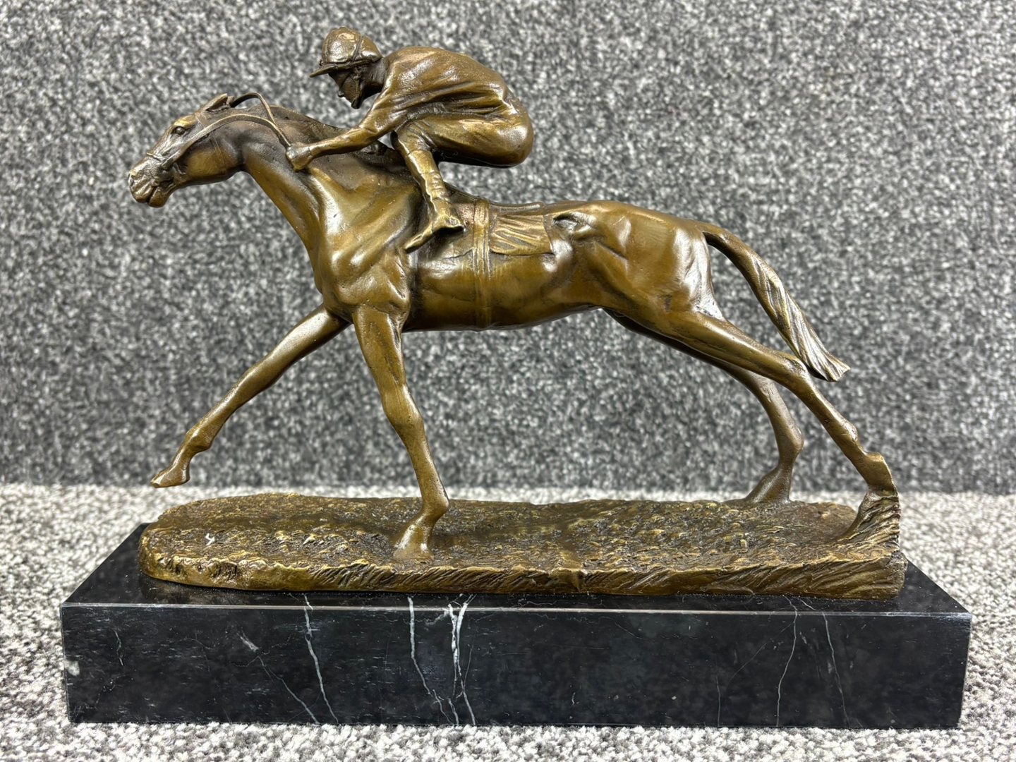 A bronze sculpture of a Jockey Riding a Horse on a black base. Approx 22cm height, 29cm width, 8cm depth.