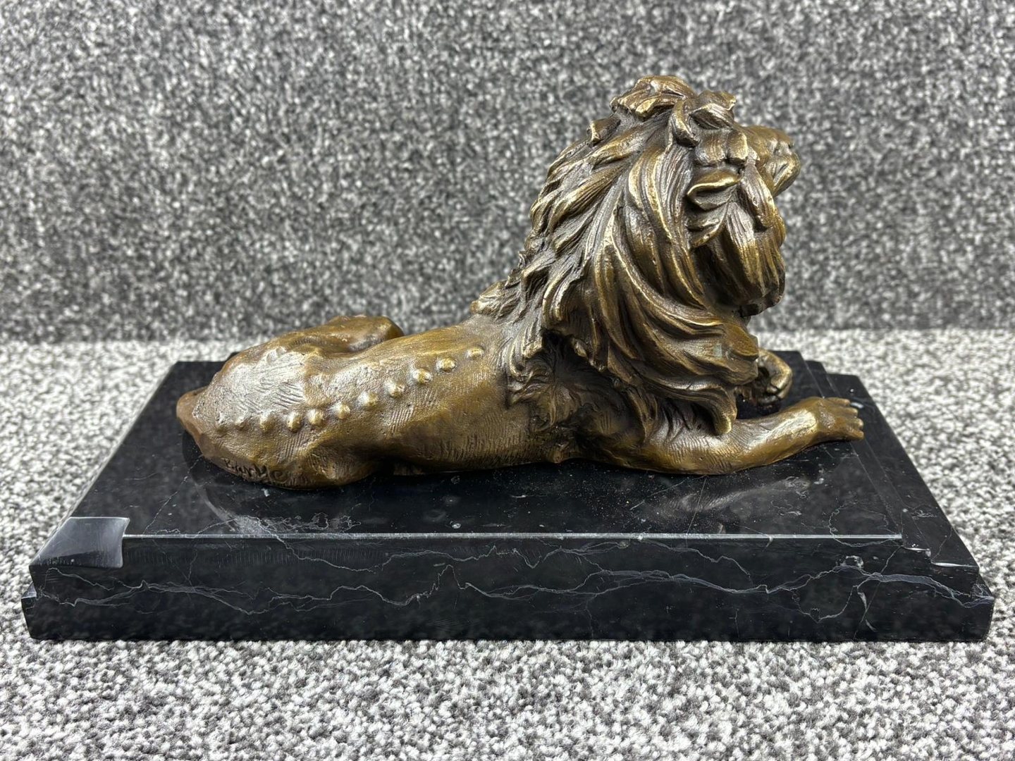 A bronze sculpture of a Roaring Lion on a black base. Approx 19cm height, 31cm width, 15cm depth.