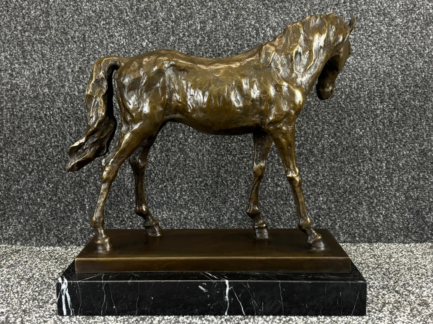 A bronze sculpture of a Standing Horse on a black base. Approx 35cm height, 36cm width, 18cm depth.