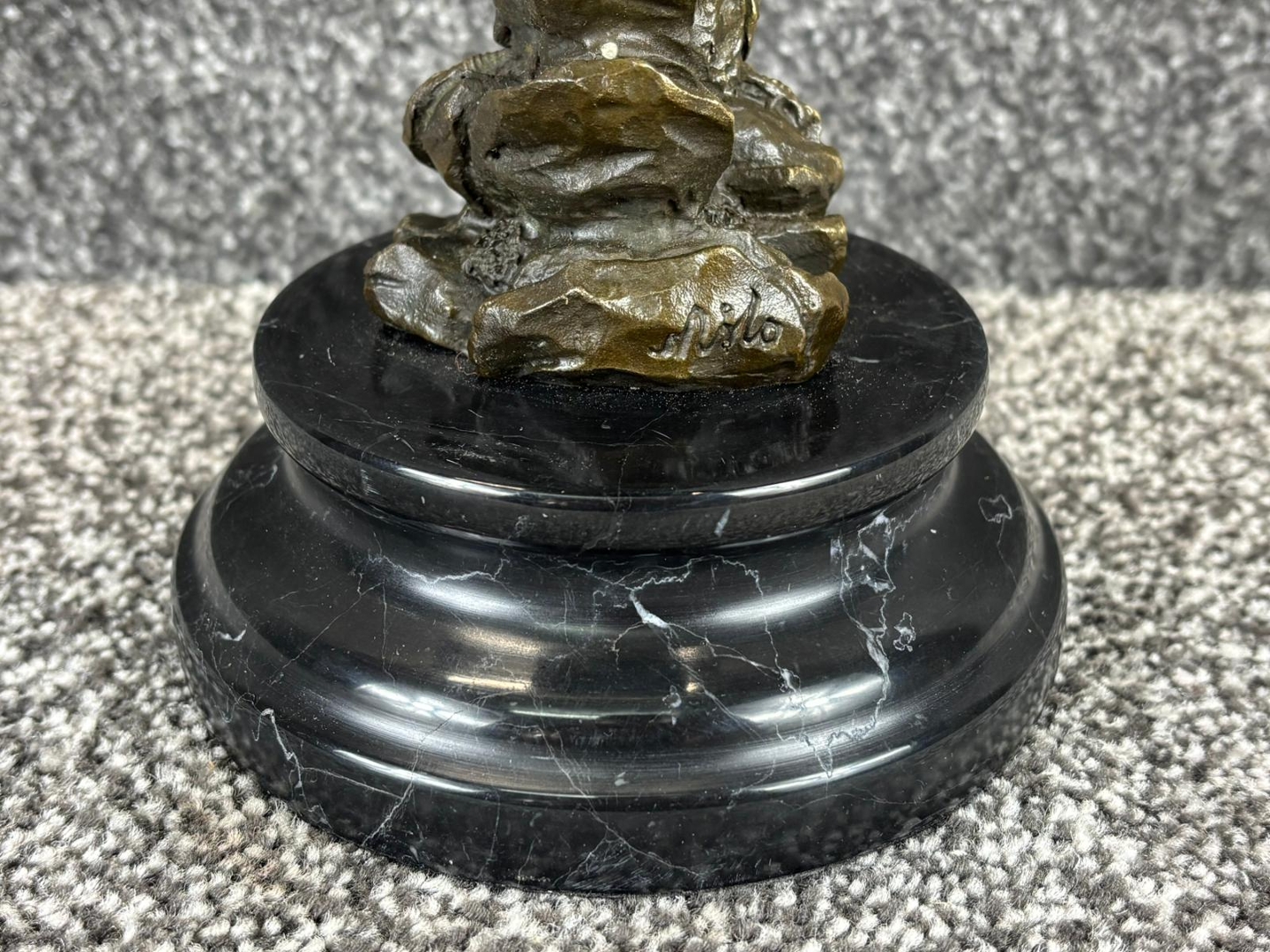 Set upon a solid black base, the contrast between the dark foundation and the warm metallic finish creates a bold, display-ready presence. The sculpture measures approximately 23cm in height, 19cm in width, and 15cm in depth, making it an ideal statement piece without overwhelming a space. The proportions are well-balanced, offering visual impact from every angle.