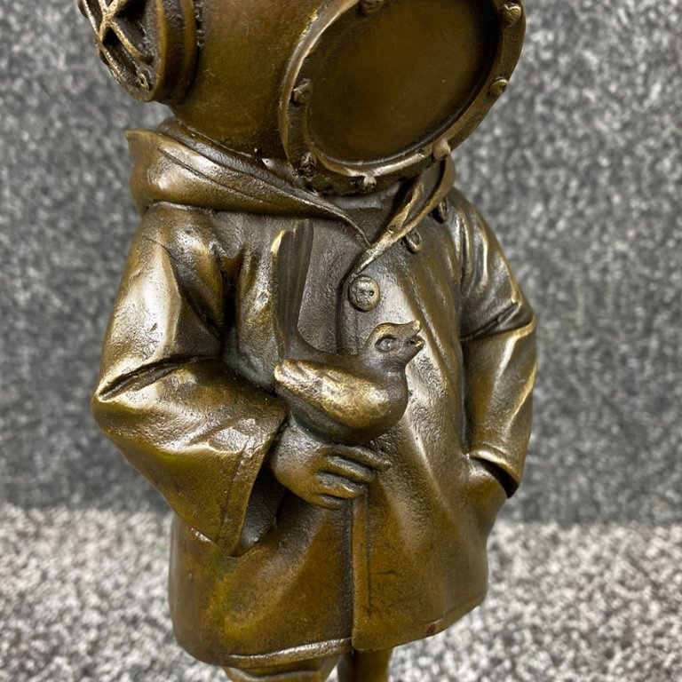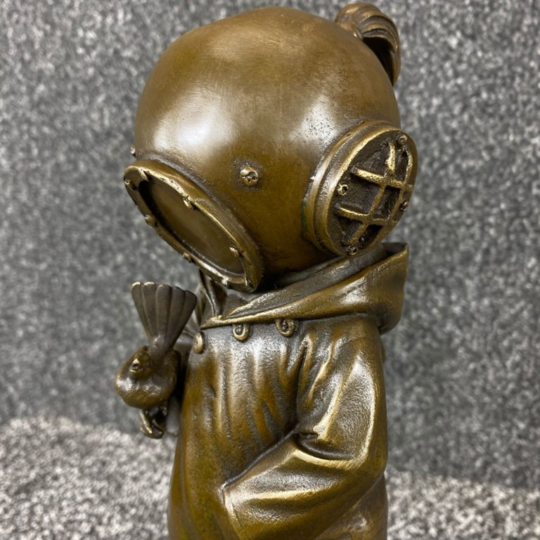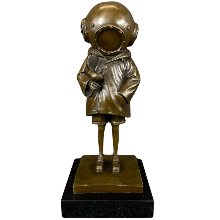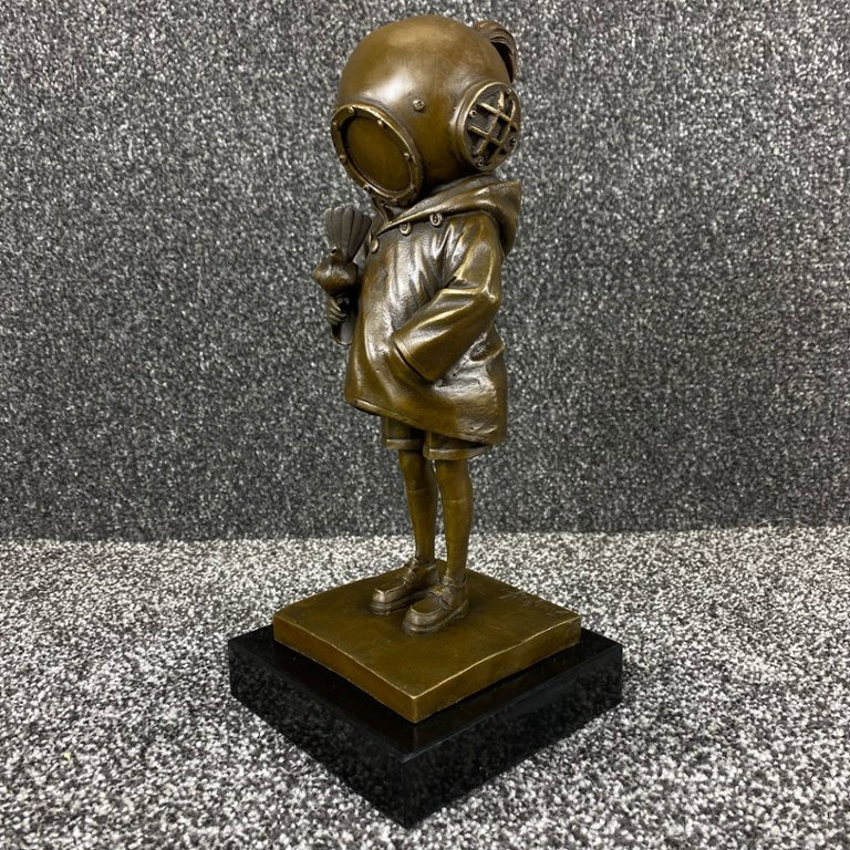A bronze sculpture, titled "Diving Helmet Girl", is a captivating interpretation of a Banksy artwork. This piece depicts a young girl wearing a large vintage diving helmet, reminiscent of deep-sea explorers. The oversized helmet contrasts with her petite frame, giving the sculpture a playful yet enigmatic quality. She wears a simple, slightly oversized coat, with her hand in her pocket, exuding a childlike innocence. In her other hand, she holds a small bird, further enhancing the theme of purity and hope, juxtaposed against the surreal helmet.