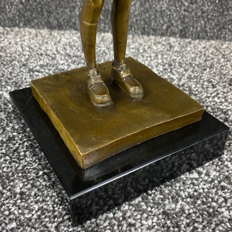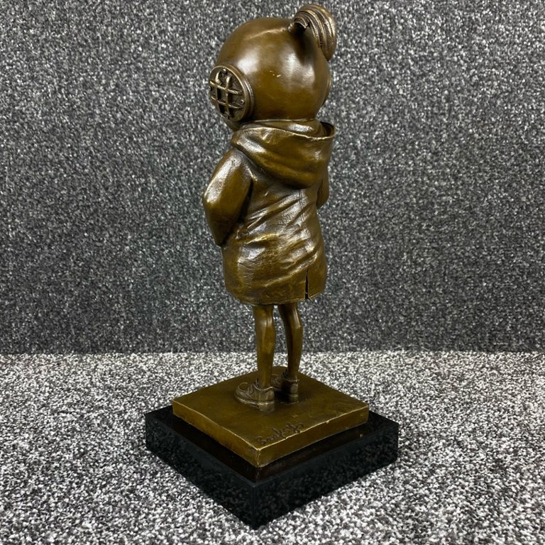 A bronze sculpture of Banksy Artwork titled Diving Helmet Girl on a black marble base.
