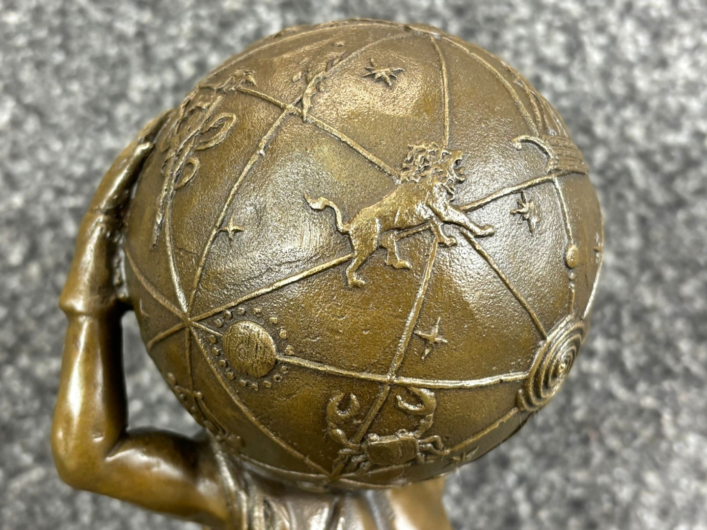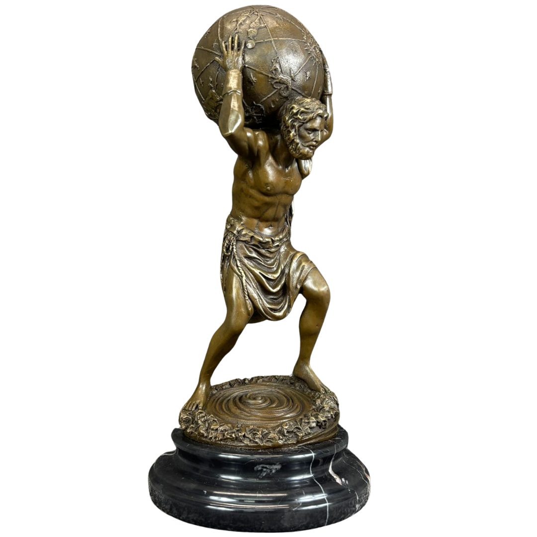 A bronze sculpture of the Titan Atlas brings to life the enduring myth of strength and burden. Standing approximately 32cm tall and measuring 14cm in both width and depth, the figure is depicted in a dramatic pose—knees bent and muscles straining as he bears the celestial sphere upon his shoulders. Every detail, from the taut musculature to the etched constellations on the globe, is expertly crafted to convey tension, resilience, and mythic grandeur.