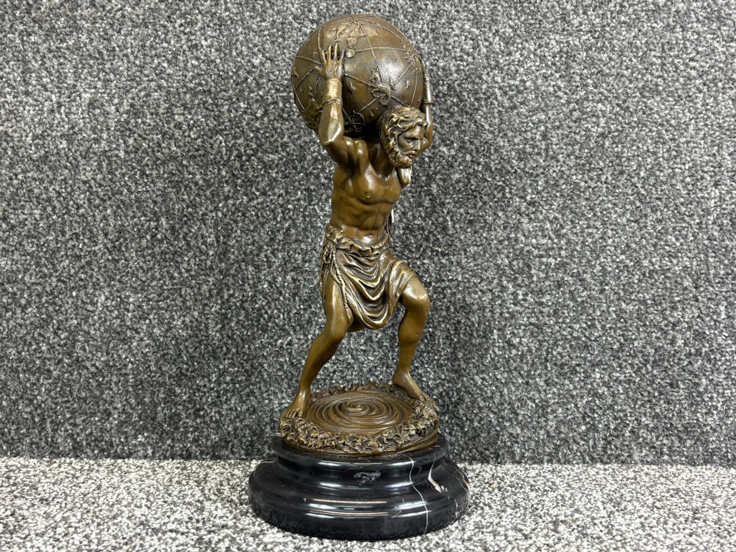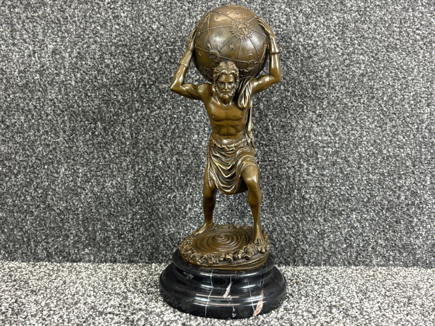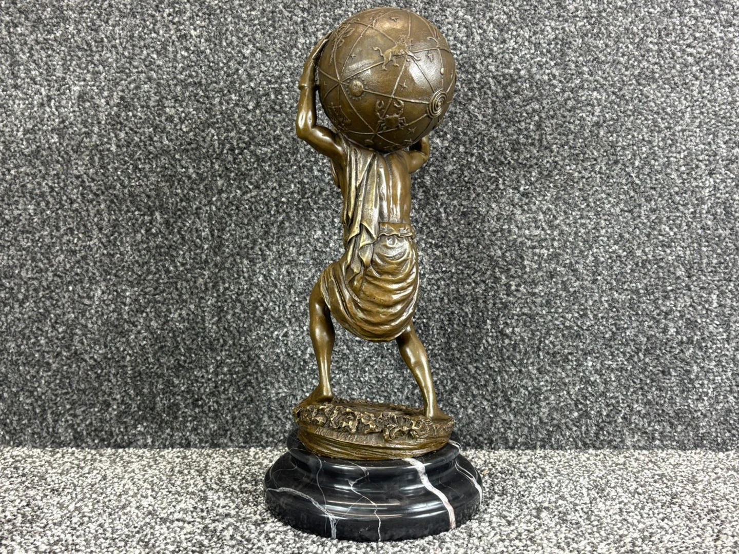 A bronze sculpture of the Titan Atlas on a black base. Approx 32cm height, 14cm width, 14cm depth.