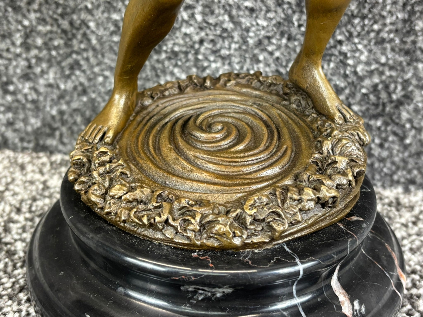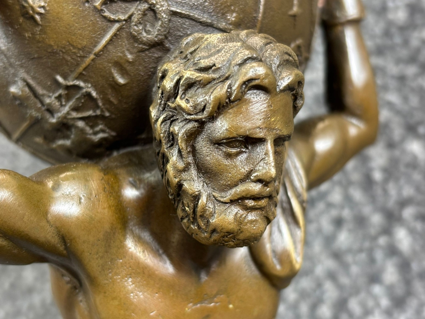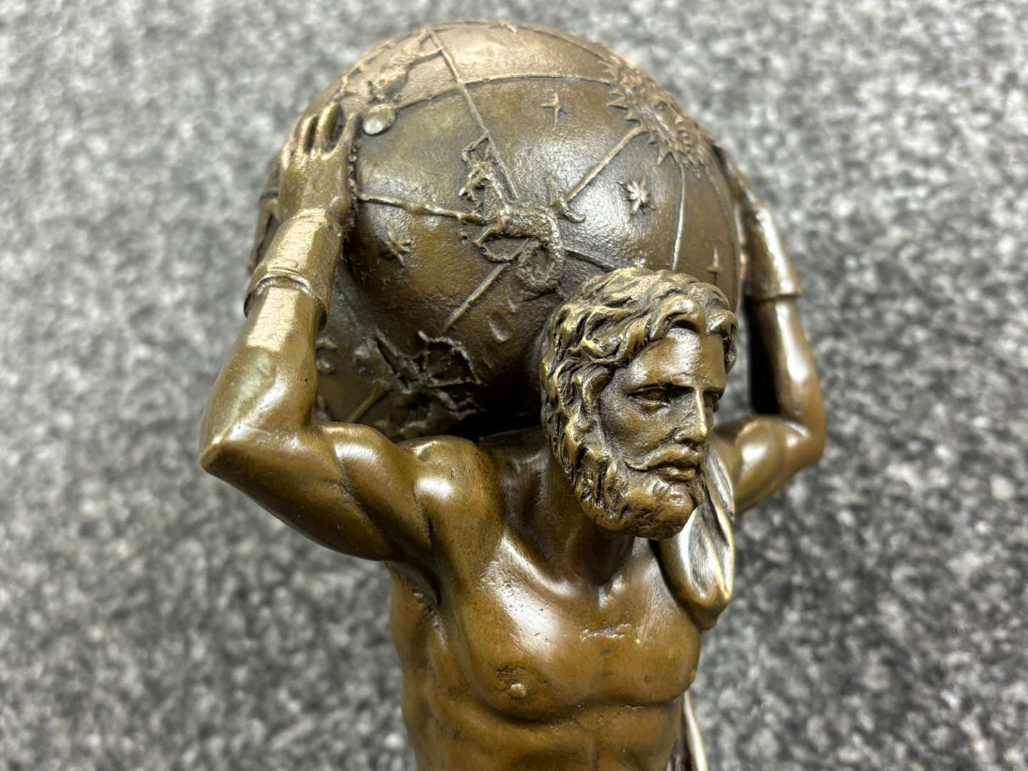 A bronze sculpture of the Titan Atlas on a black base. Approx 32cm height, 14cm width, 14cm depth.