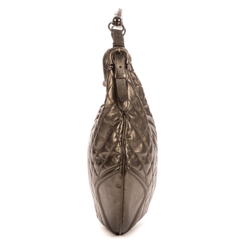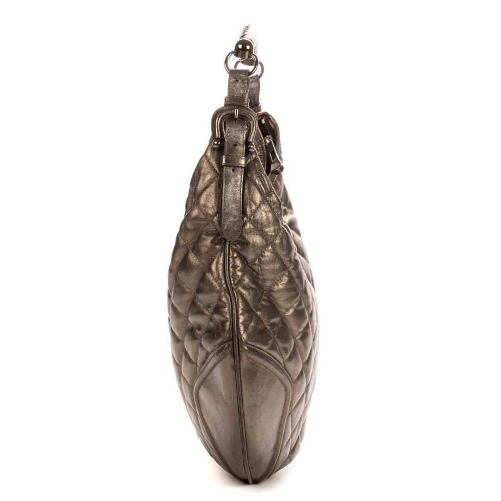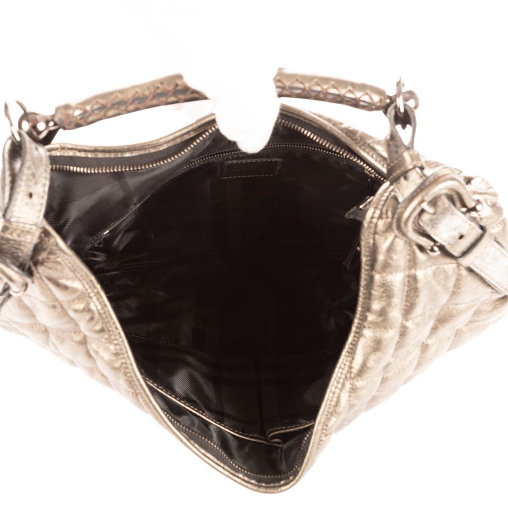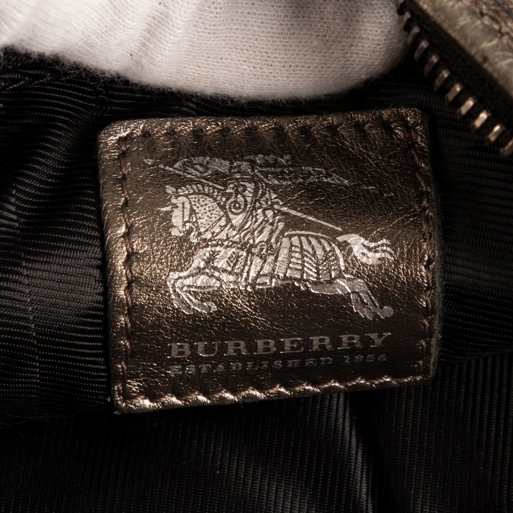Graded AB, this vintage example displays moderate signs of previous use, most visibly on the leather, where light creasing and wear contribute to its lived-in character. Despite this, the bag remains in good overall condition, retaining its striking silhouette and distinctive metallic finish. With its bold aesthetic, practical form and verified authenticity, the Hoxton Hobo stands as an appealing choice for collectors and admirers of unique Burberry design.