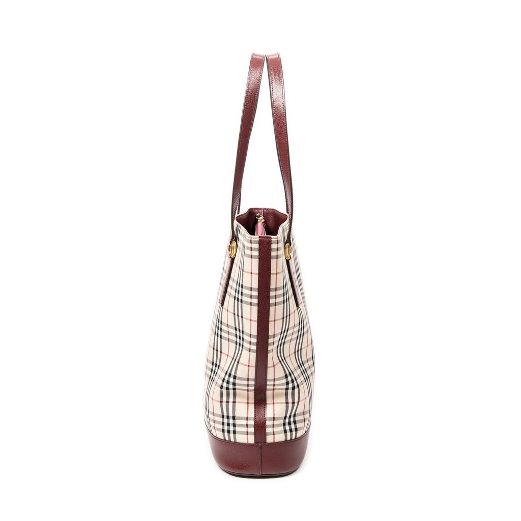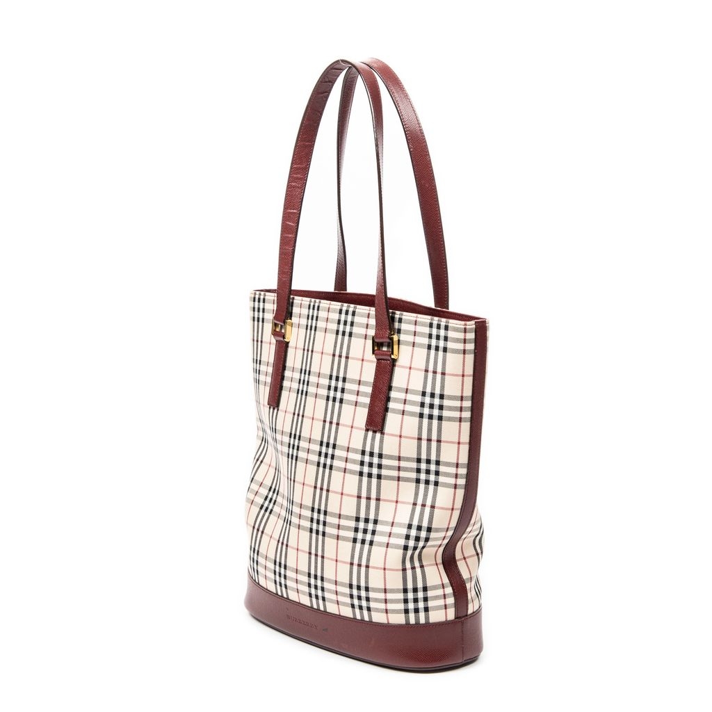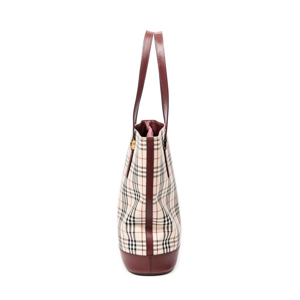 A vintage Burberry beige/burgundy canvas Large Tall Tote bag with a certificate of authenticity, Approximately 32cm height, 28cm width.