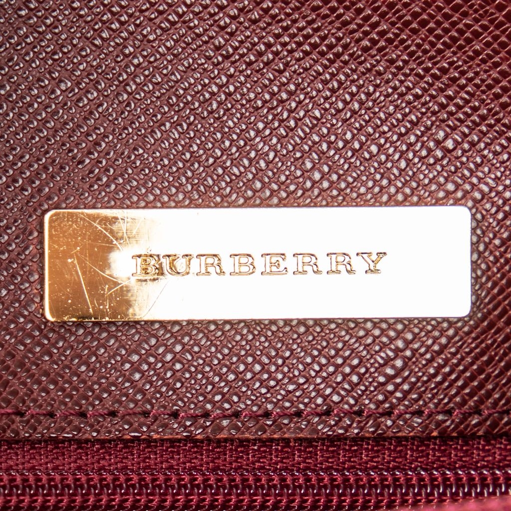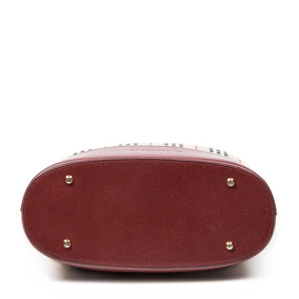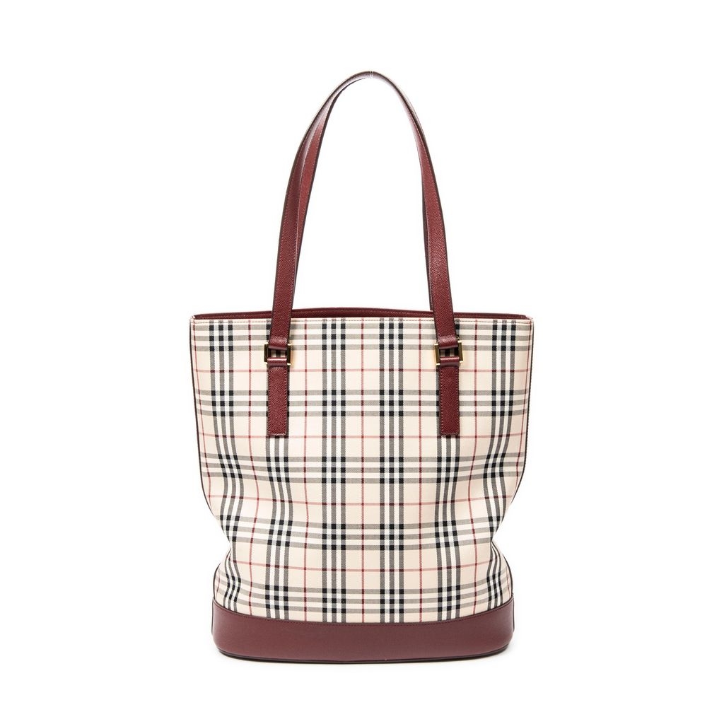 A vintage Burberry beige/burgundy canvas Large Tall Tote bag with a certificate of authenticity, Approximately 32cm height, 28cm width.