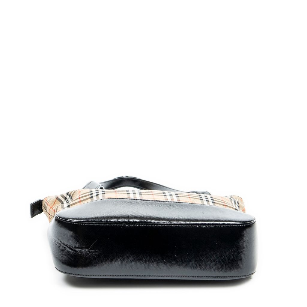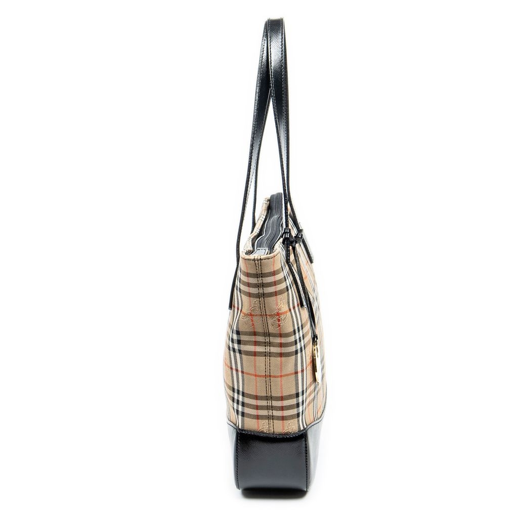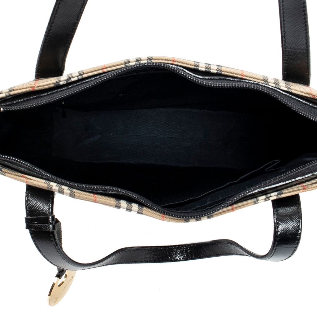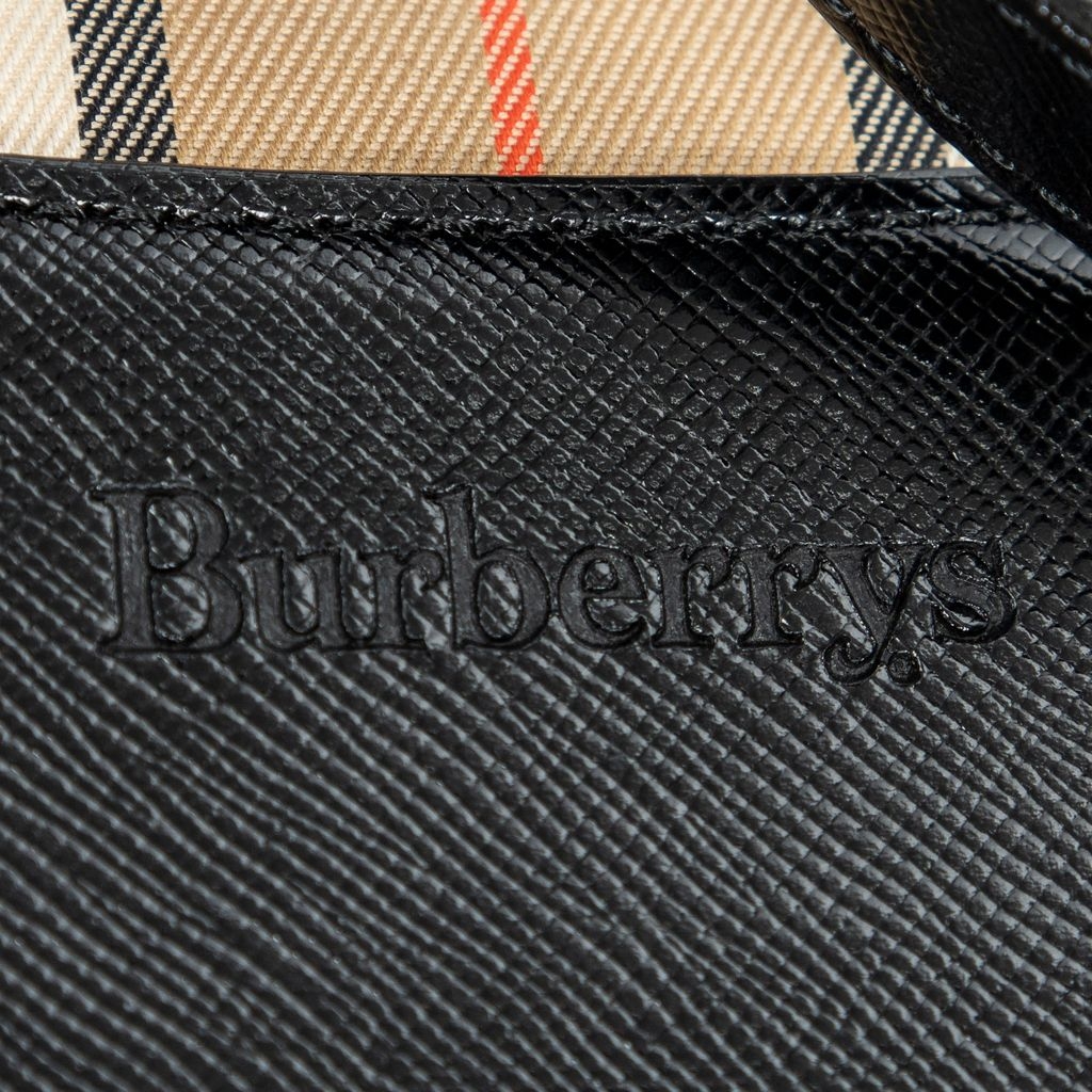 A vintage beige and black canvas Burberry Small Charm Tote bag with a certificate of authenticity, Approximately 24cm height, 25cm width.