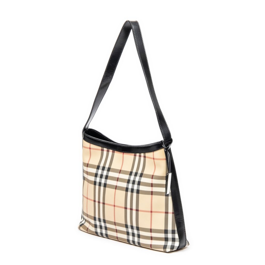 A vintage Burberry beige/black coated canvas Square Hobo bag, accompanied by a certificate of authenticity, showcases the brand’s unmistakable check pattern and sleek, minimalist design. Crafted from durable coated canvas with black leather trim and strap, this piece embodies Burberry’s timeless blend of elegance and practicality. The structured square silhouette offers a refined yet casual appeal, making it a versatile choice for daily use.