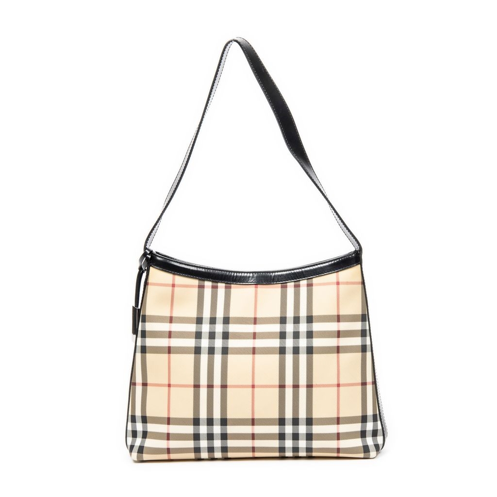 Measuring approximately 25cm in height and 29cm in width, this compact yet functional bag provides ample room for essentials without feeling bulky. The single shoulder strap ensures a comfortable carry, while the top zip closure keeps belongings secure. The smooth black leather edges contrast beautifully with the beige check, enhancing its polished aesthetic and reinforcing the bag’s durability.