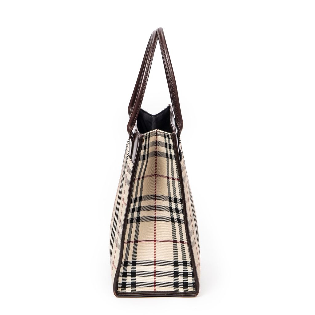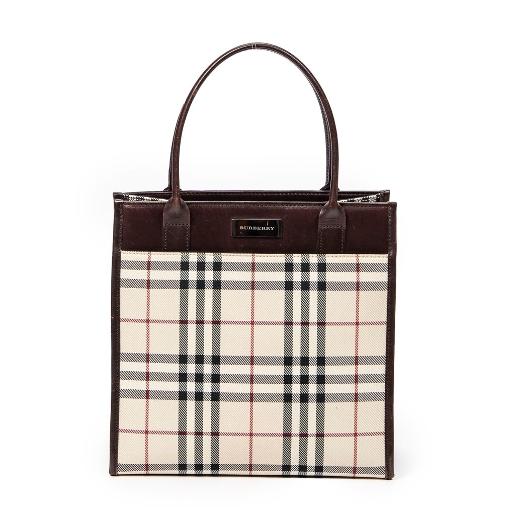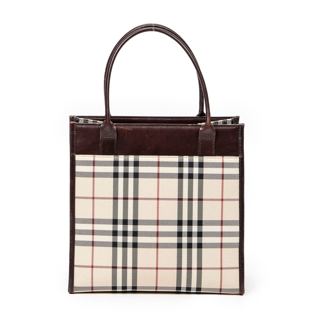 A vintage Burberry beige/dark brown canvas Square Open Tote bag with a certificate of authenticity, Approximately 22cm height, 22cm width.