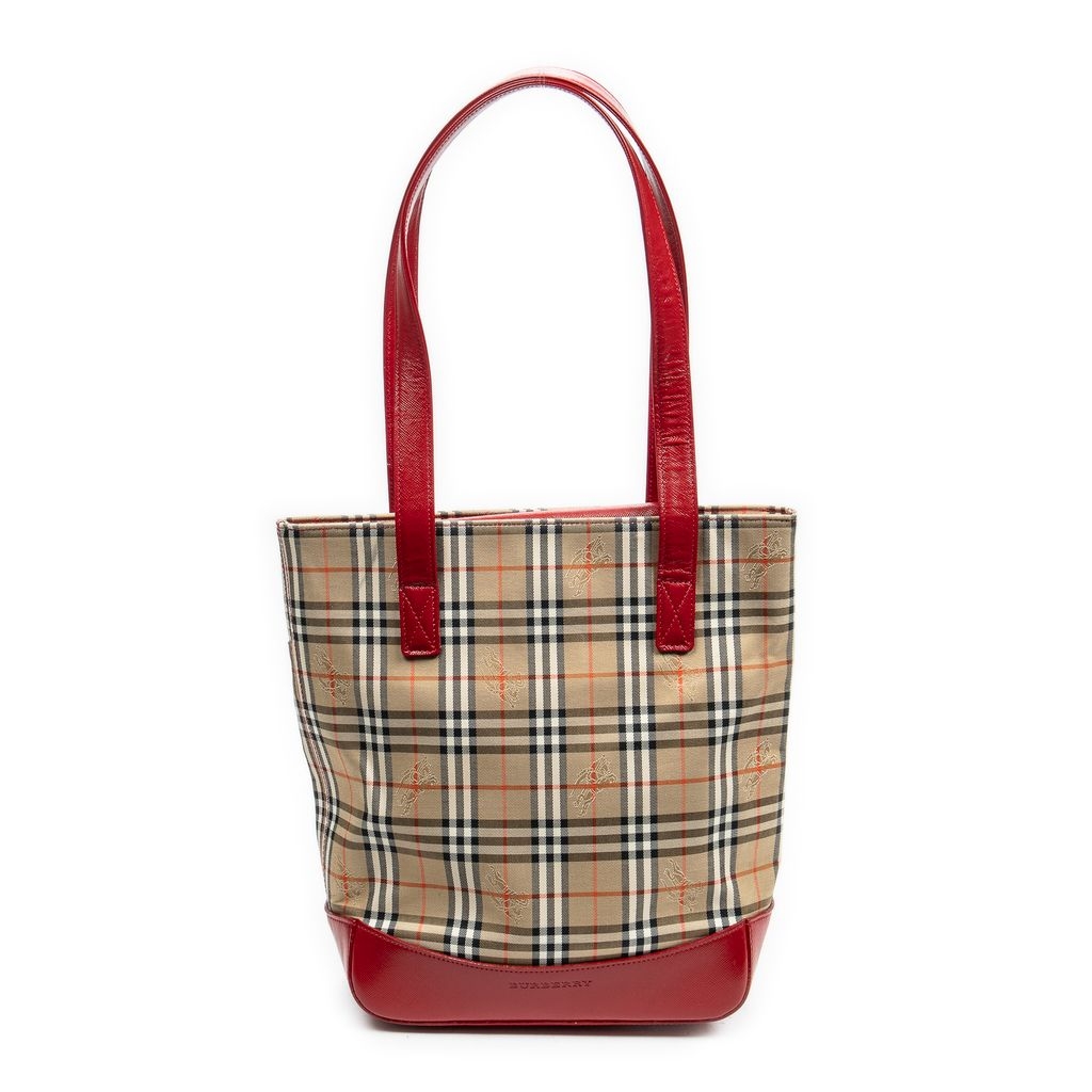 A vintage Burberry beige/red canvas Tall Tote bag with a certificate of authenticity, Approximately 29cm height, 22cm width.