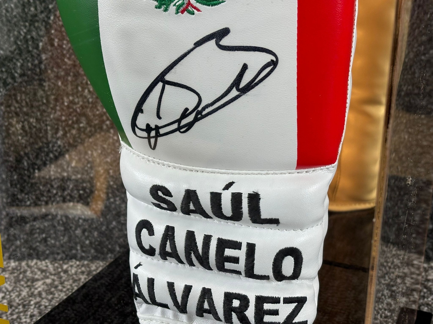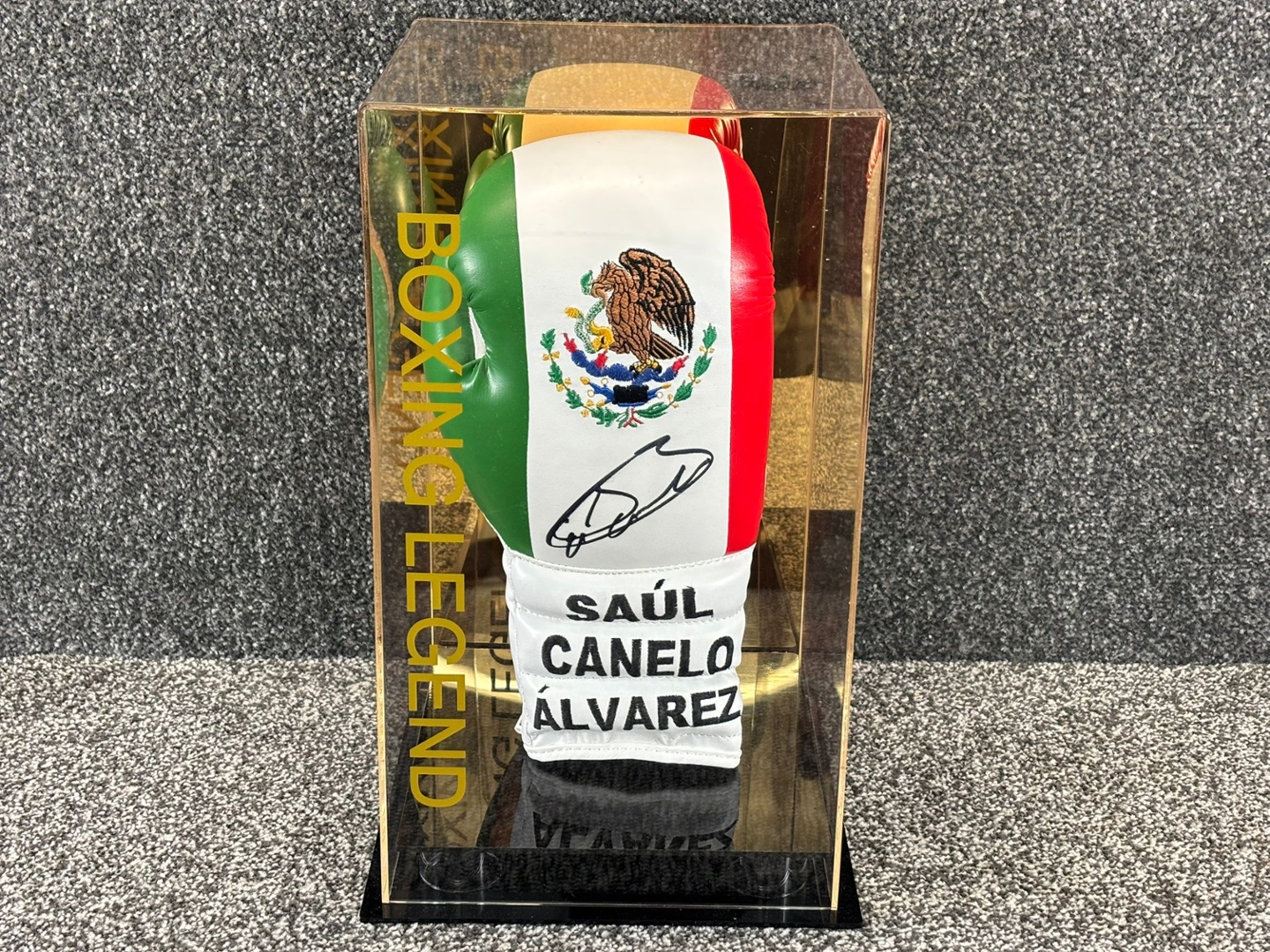 A signed and authenticated Canelo Alvarez Boxing Glove in a presentation case. Approx 15" height, 9" width.