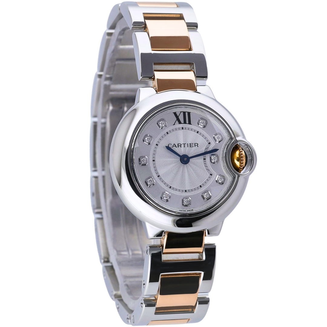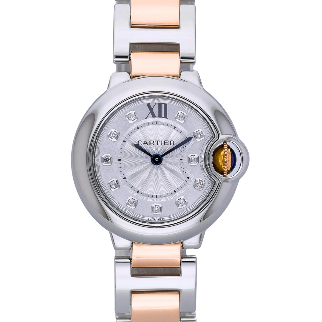 A Cartier Ballon Bleu, presented in a sophisticated bi-metal combination of stainless steel and 18ct rose gold, embodies the refined elegance the collection is known for. The 28mm case frames a silvered dial with a delicate guilloché pattern, elevated by diamond-set hour markers and a Roman numeral at 12 o’clock. Blue steel hands provide a striking contrast, while the signature crown, set with a blue cabochon and seamlessly integrated into the case, defines the unmistakable Ballon Bleu silhouette.