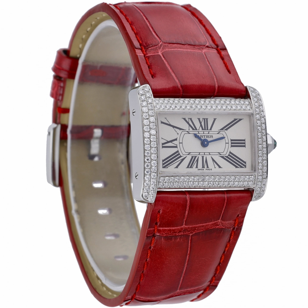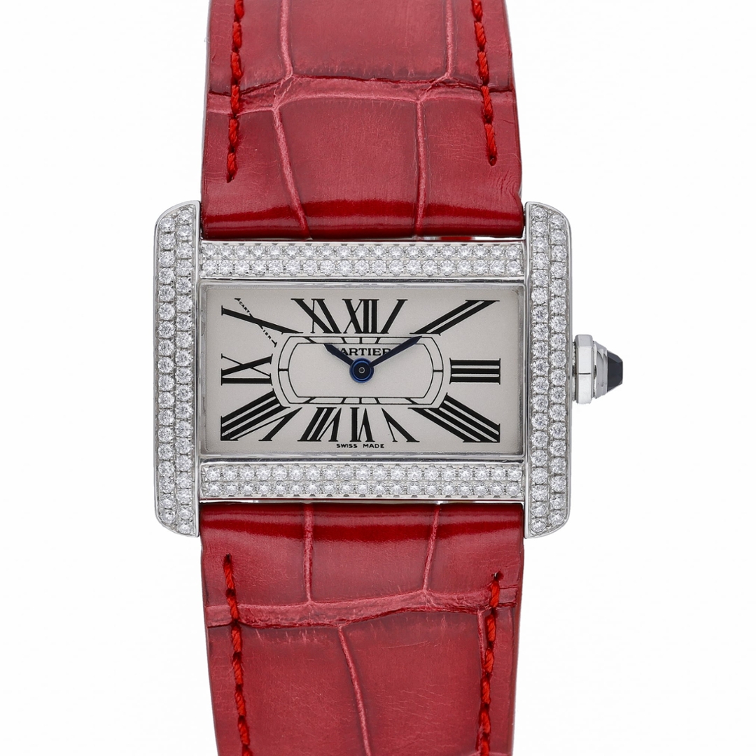Completing the design is a vibrant red leather strap paired with a stainless steel clasp, creating a striking contrast against the diamond-set case and giving the watch a distinctive and contemporary presence on the wrist. Elegant, stylish, and unmistakably Cartier, the Divan remains a unique addition to the maison’s celebrated watchmaking catalogue.
