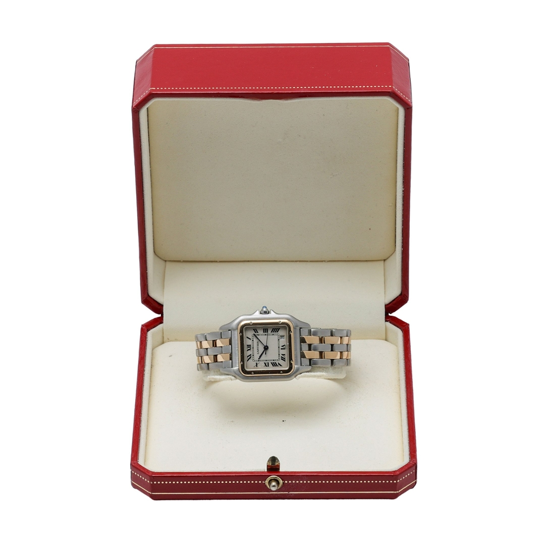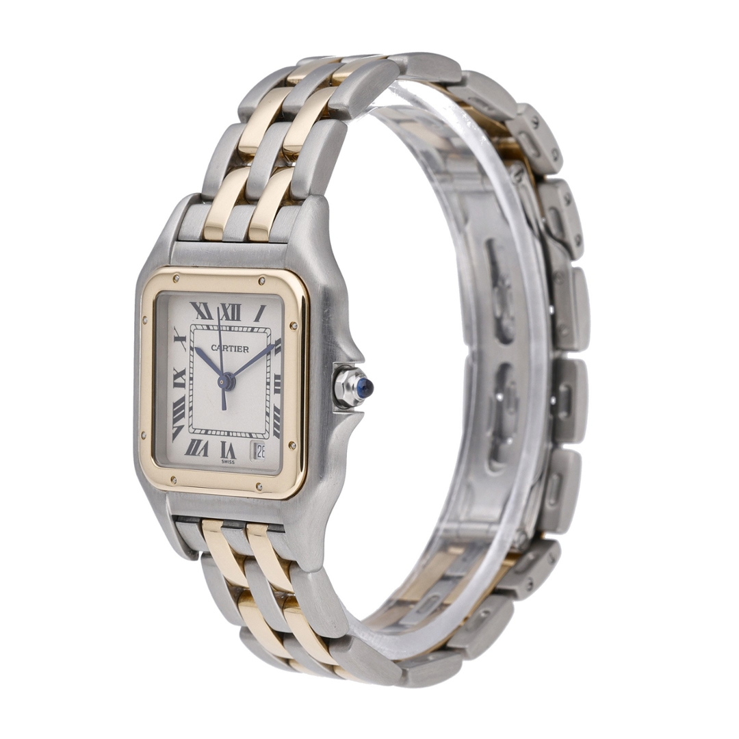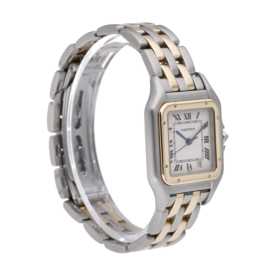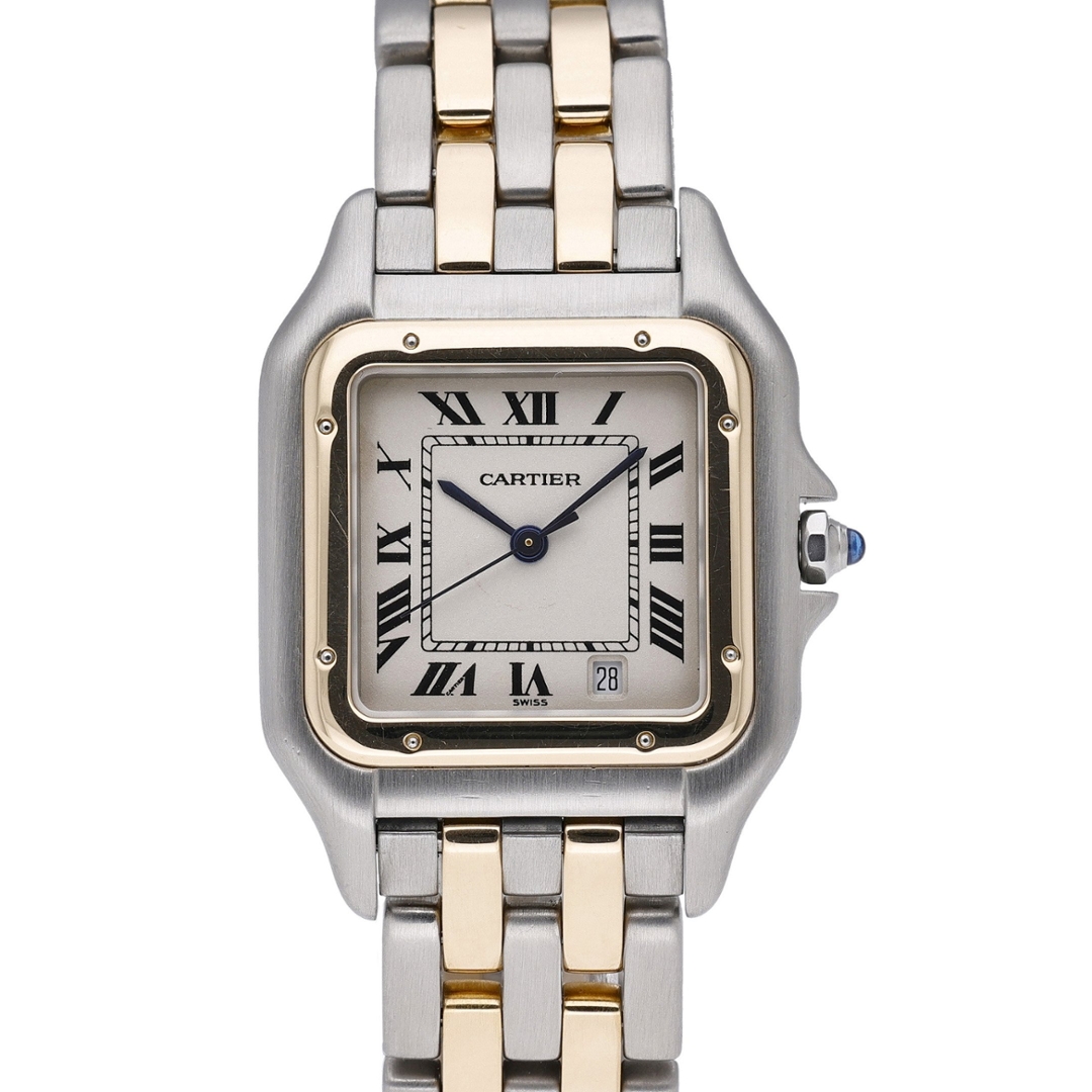 A Cartier Panthère, presented in its classic bi-metal configuration of stainless steel and 18ct yellow gold, paired with the iconic white dial featuring Roman numerals and blued steel hands. This instantly recognisable design remains one of Cartier’s most celebrated creations, offering understated elegance with strong brand heritage.