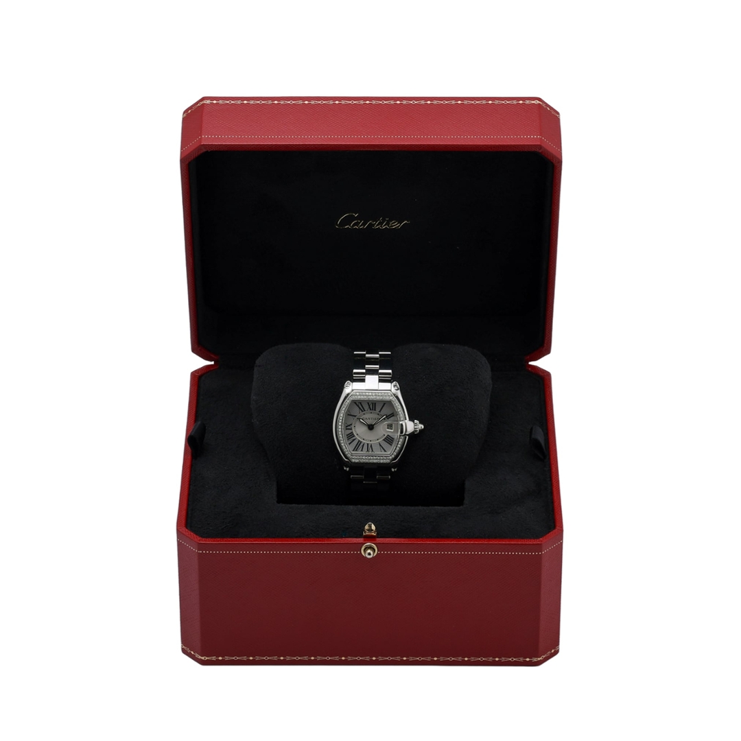 A Cartier Roadster Watch, Stainless Steel with an Afterset Diamond Bezel on a Silver Dial