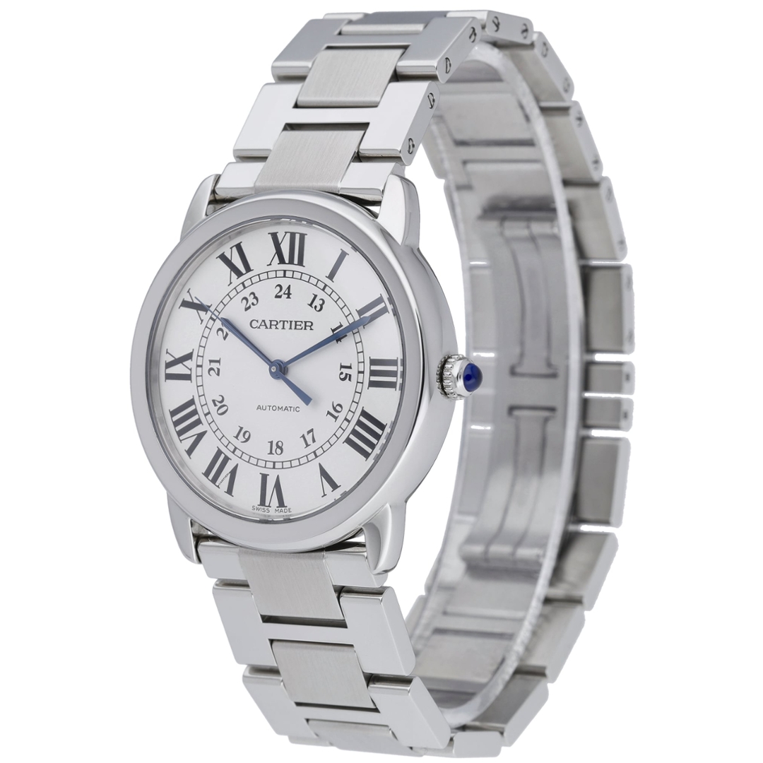 A Cartier Ronde Solo is a refined and understated expression of the brand’s classic design language, presented here in a 36mm stainless steel case that sits comfortably on the wrist. The clean white dial features bold black Roman numerals, a railway minute track, and blued steel sword hands, delivering immediate recognition and timeless appeal. A central 24-hour inner track adds subtle visual interest while maintaining excellent legibility.