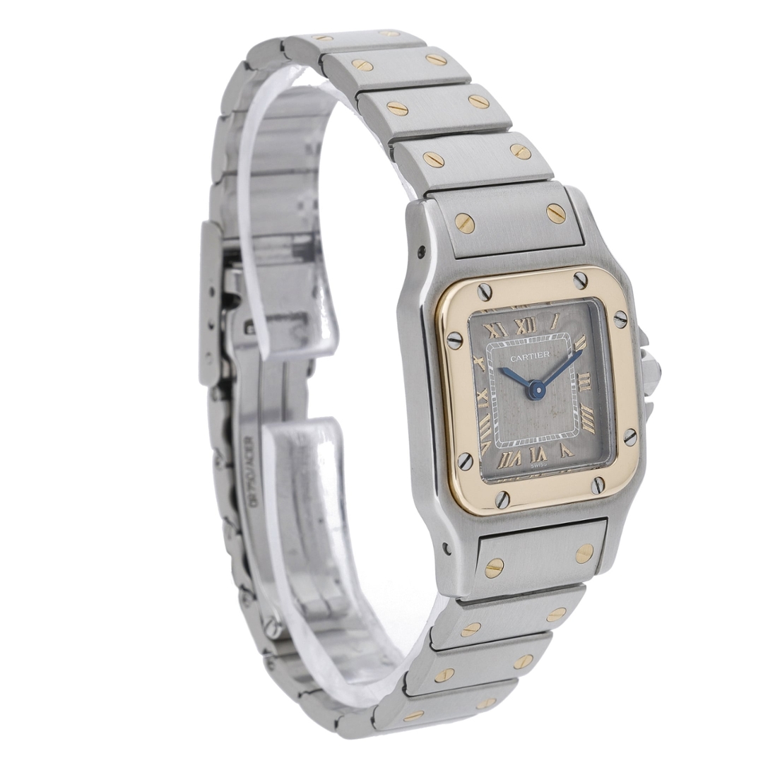 A Cartier Santos Galbée in bi-metal stainless steel and 18ct yellow gold, presenting a refined and highly recognisable interpretation of one of Cartier’s most iconic designs. The compact square case is framed by the signature exposed screws, mirrored throughout the bracelet for a cohesive and unmistakably Cartier aesthetic. This example features a distinctive grey dial, accented with gold-tone Roman numerals and a subtle inner minute track, paired with elegant blued steel hands and a classic cabochon-set crown, delivering a sophisticated, slightly more contemporary variation of the traditional Santos look.