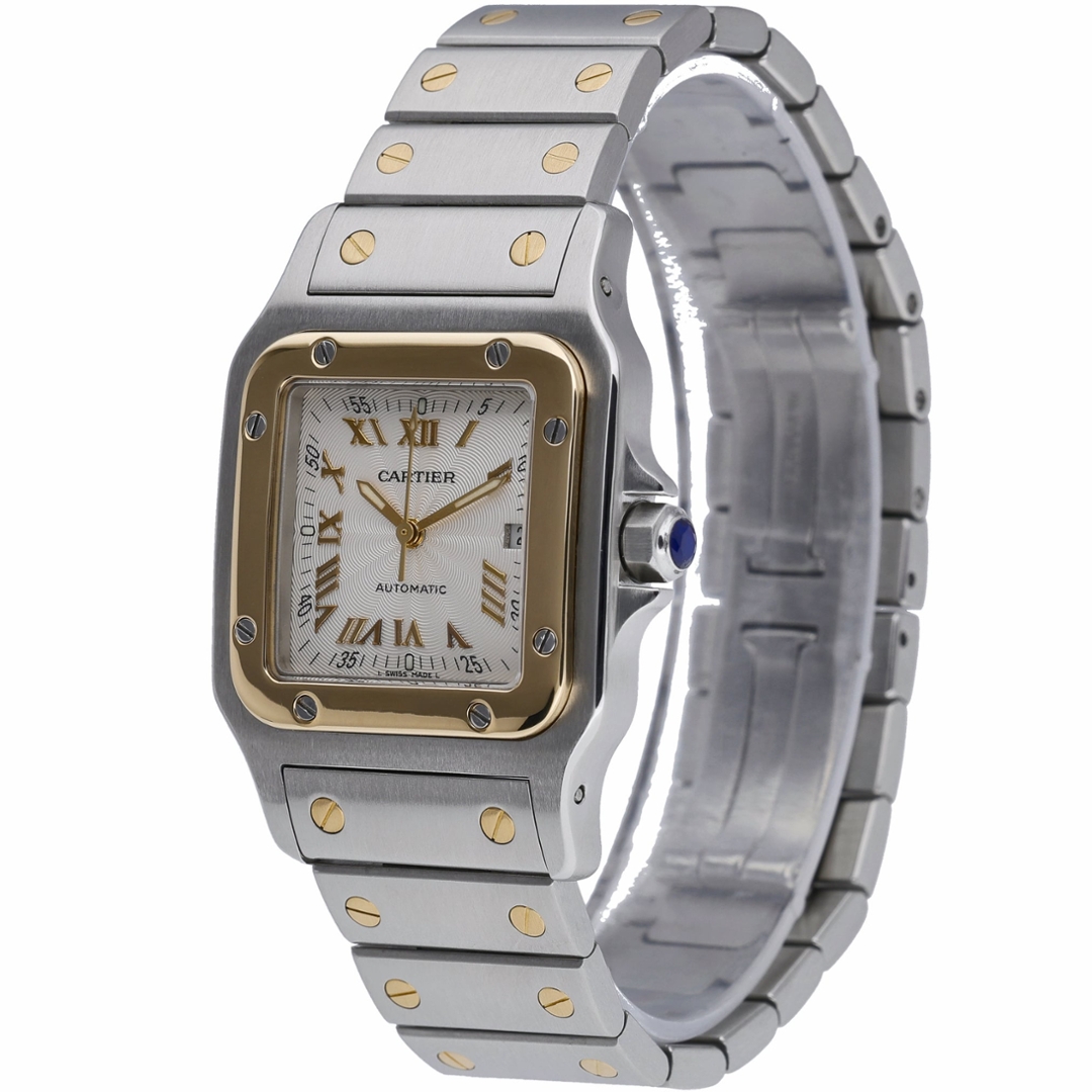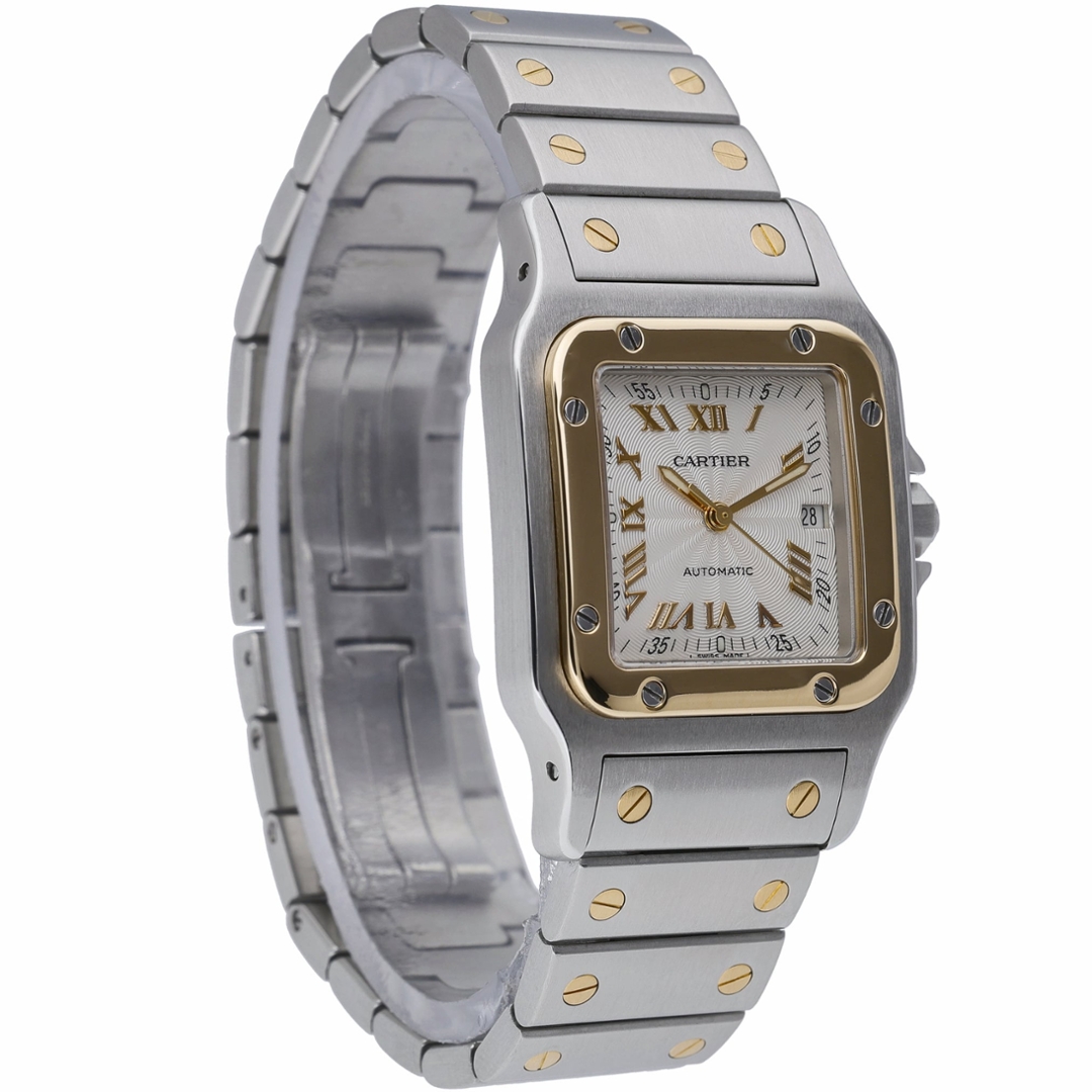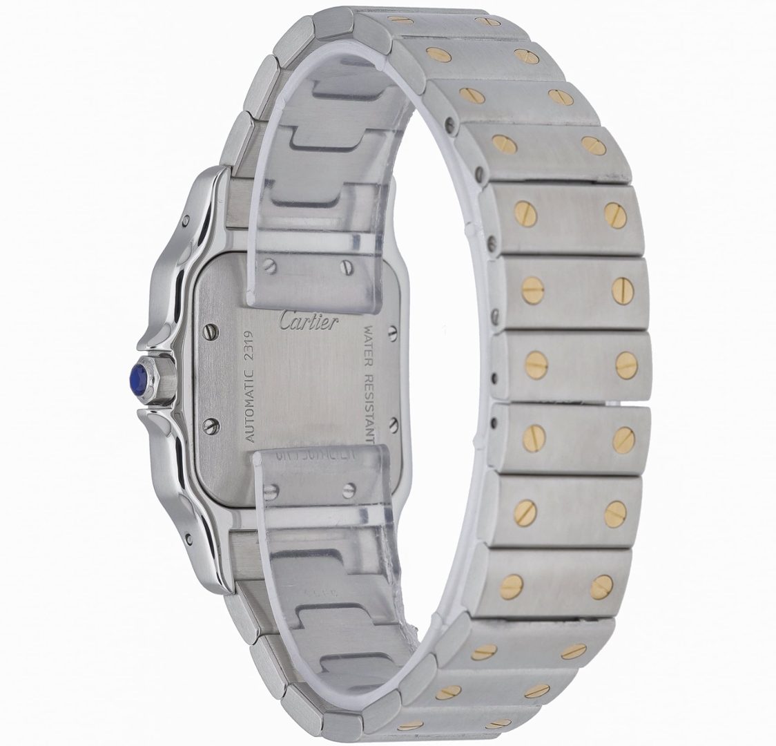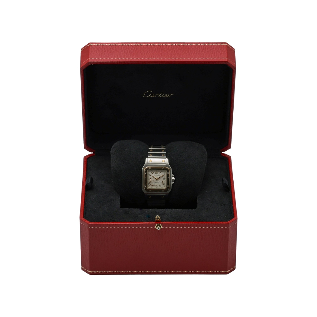 A Cartier Santos Watch in bi-metal stainless steel and 18ct yellow gold, reference 2319, presented in immaculate condition, showcasing one of Cartier’s most iconic and enduring designs. The 28mm case offers a refined and compact profile, paired with the signature integrated bracelet featuring exposed screws and contrasting gold accents. The yellow gold bezel frames the dial beautifully, reinforcing the distinctive Santos aesthetic and its instantly recognisable form.