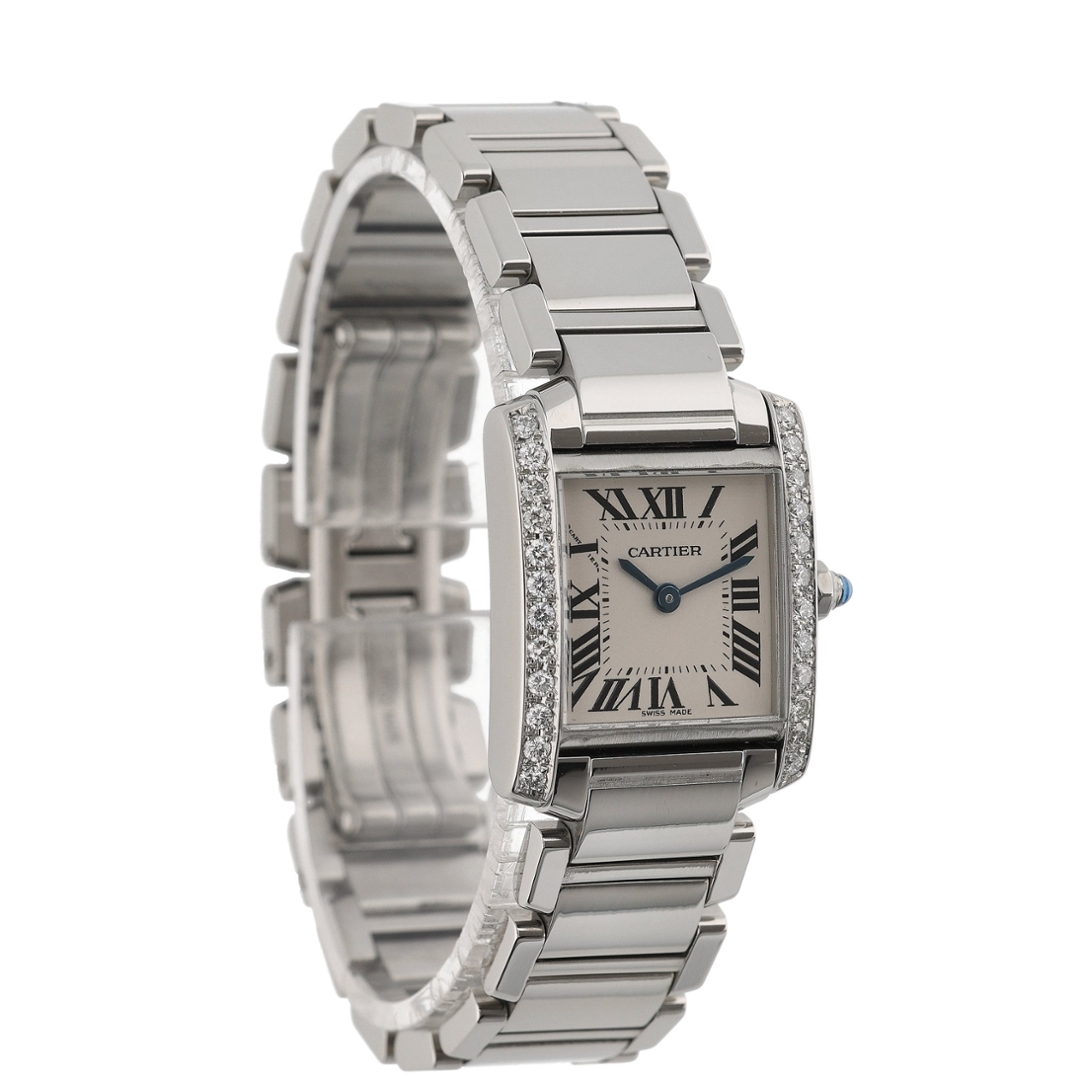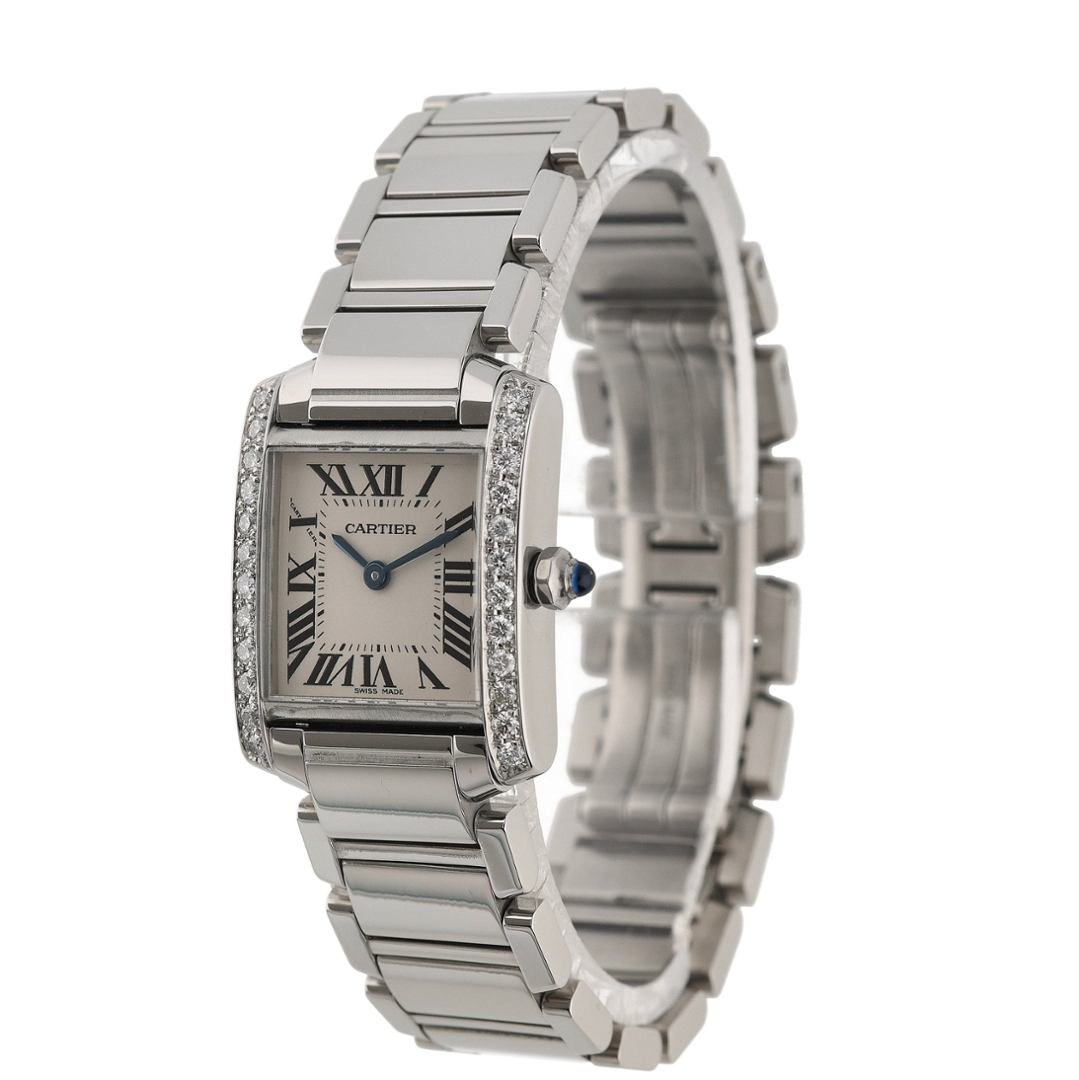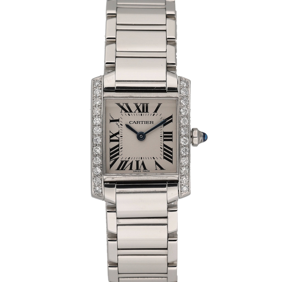 A Cartier Tank Francaise Watch, Stainless Steel with a Diamond Bezel on a White Dial