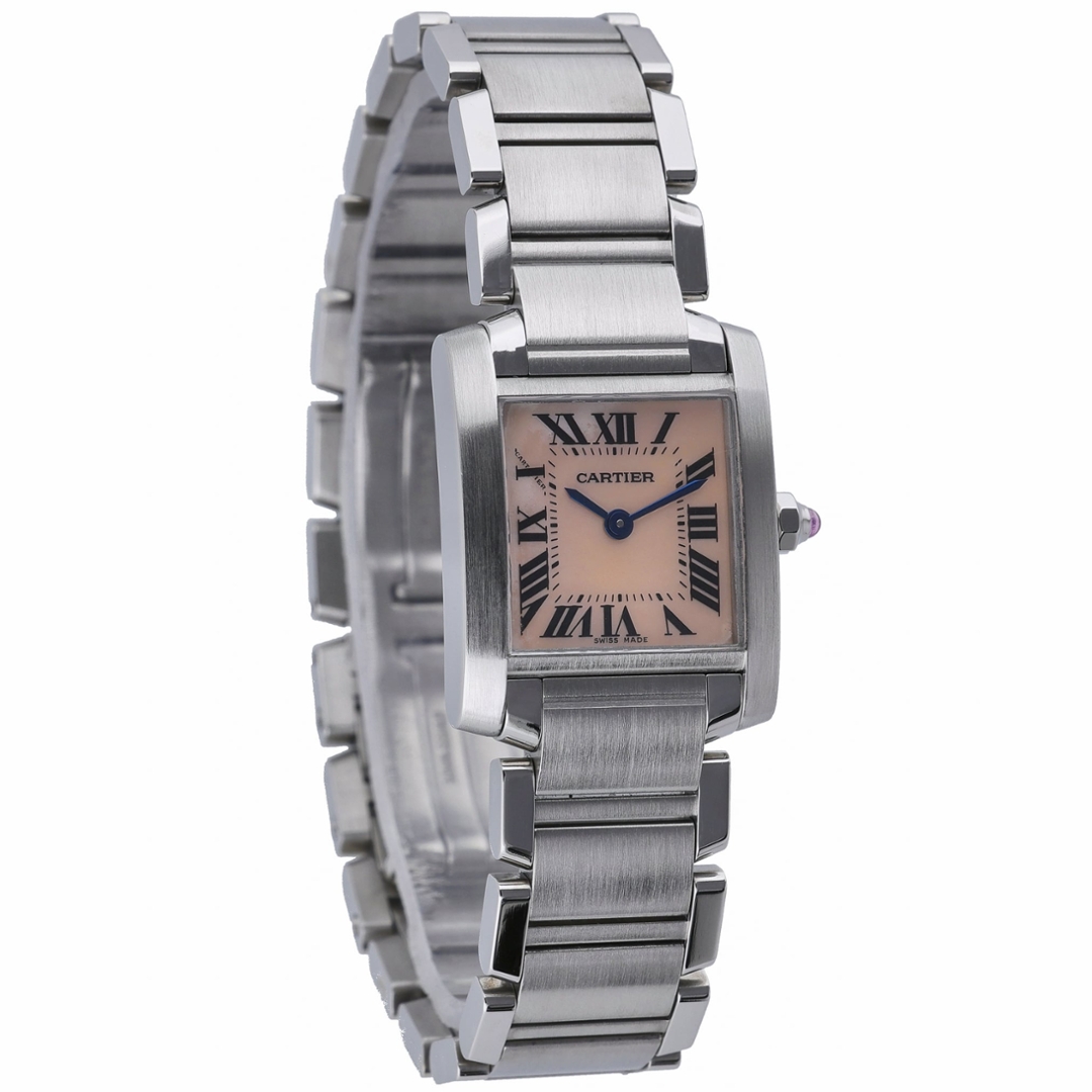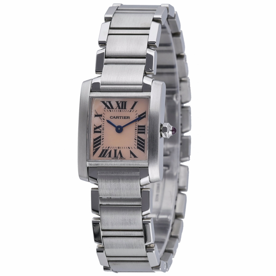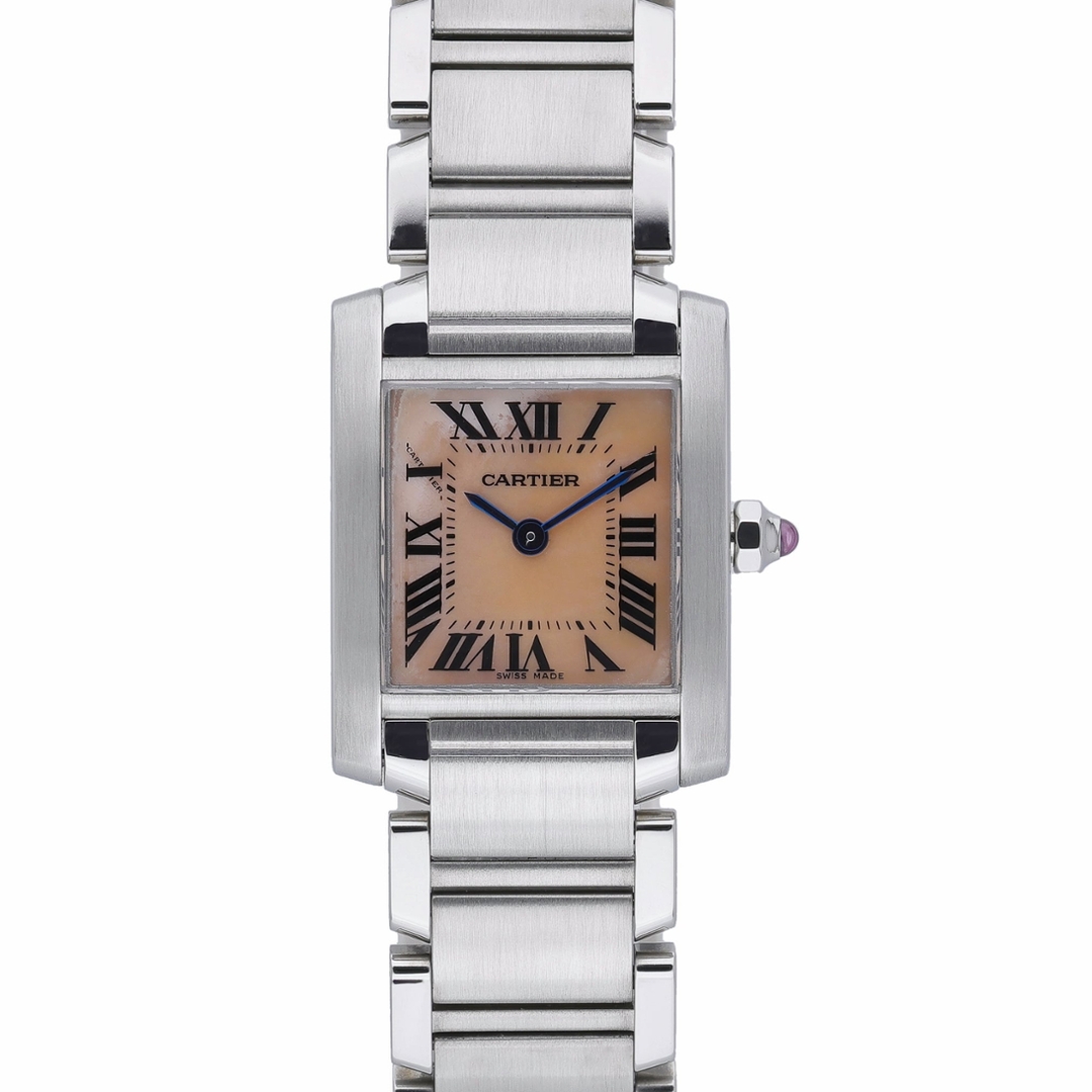 A Cartier Tank Francaise 2384 is an exquisite timepiece that embodies the brand's legacy of timeless elegance and sophisticated design. This watch features a 20mm stainless steel case that exudes a delicate yet strong presence, perfect for those seeking a refined, understated accessory. The stunning mother-of-pearl dial adds a luxurious touch, with its iridescent surface creating a captivating contrast with the bold Roman numeral markers and blue steel hands, ensuring both beauty and functionality.