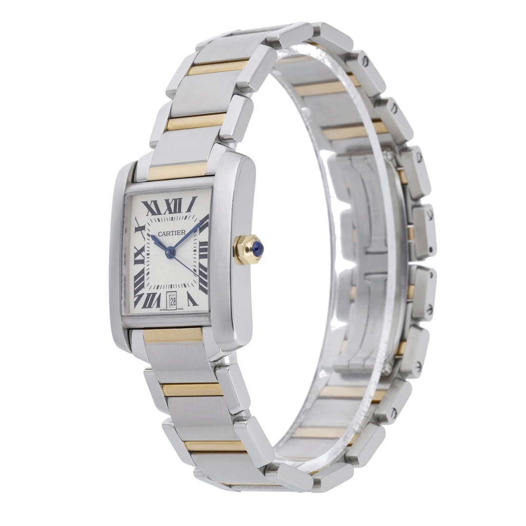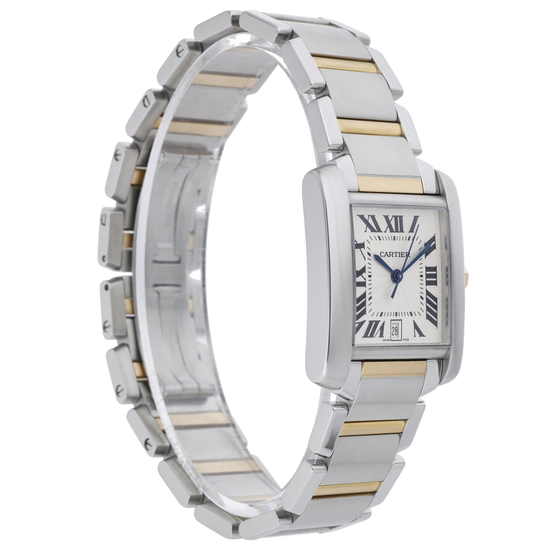A bi-metal Cartier Tank Française 2302, this 28mm stainless-steel and yellow-gold example offers the unmistakable elegance that has made the Tank line one of the most enduring designs in watchmaking. The stainless-steel case frames a crisp white dial with bold Roman numerals and blued steel hands, creating the classic Cartier aesthetic collectors continue to value. Its two-tone bracelet adds subtle warmth without compromising the refined geometric profile of the Française design.