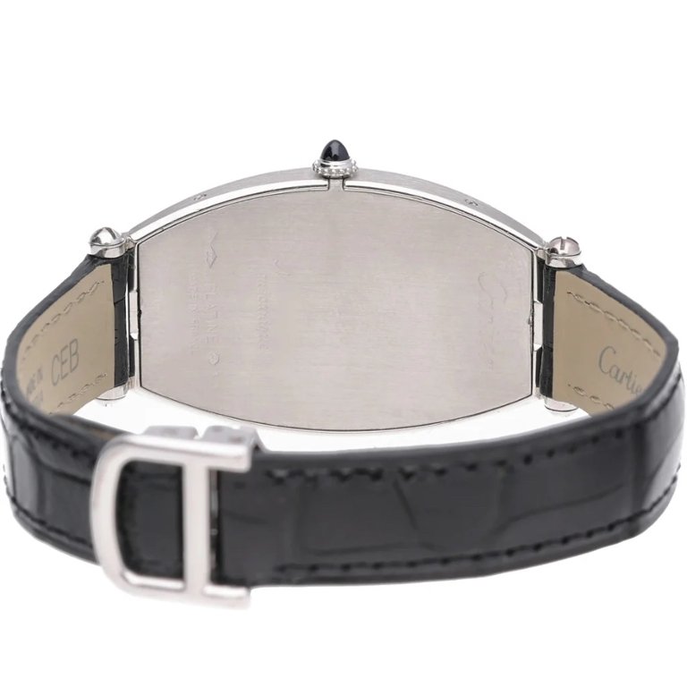 A Cartier Tonneau Watch, Black Leather Strap with a Platinum Case, Clasp, & Bezel on a White Dial.