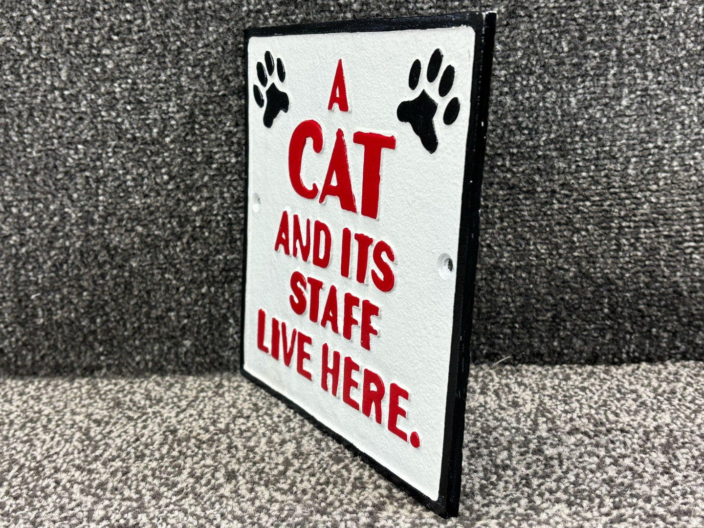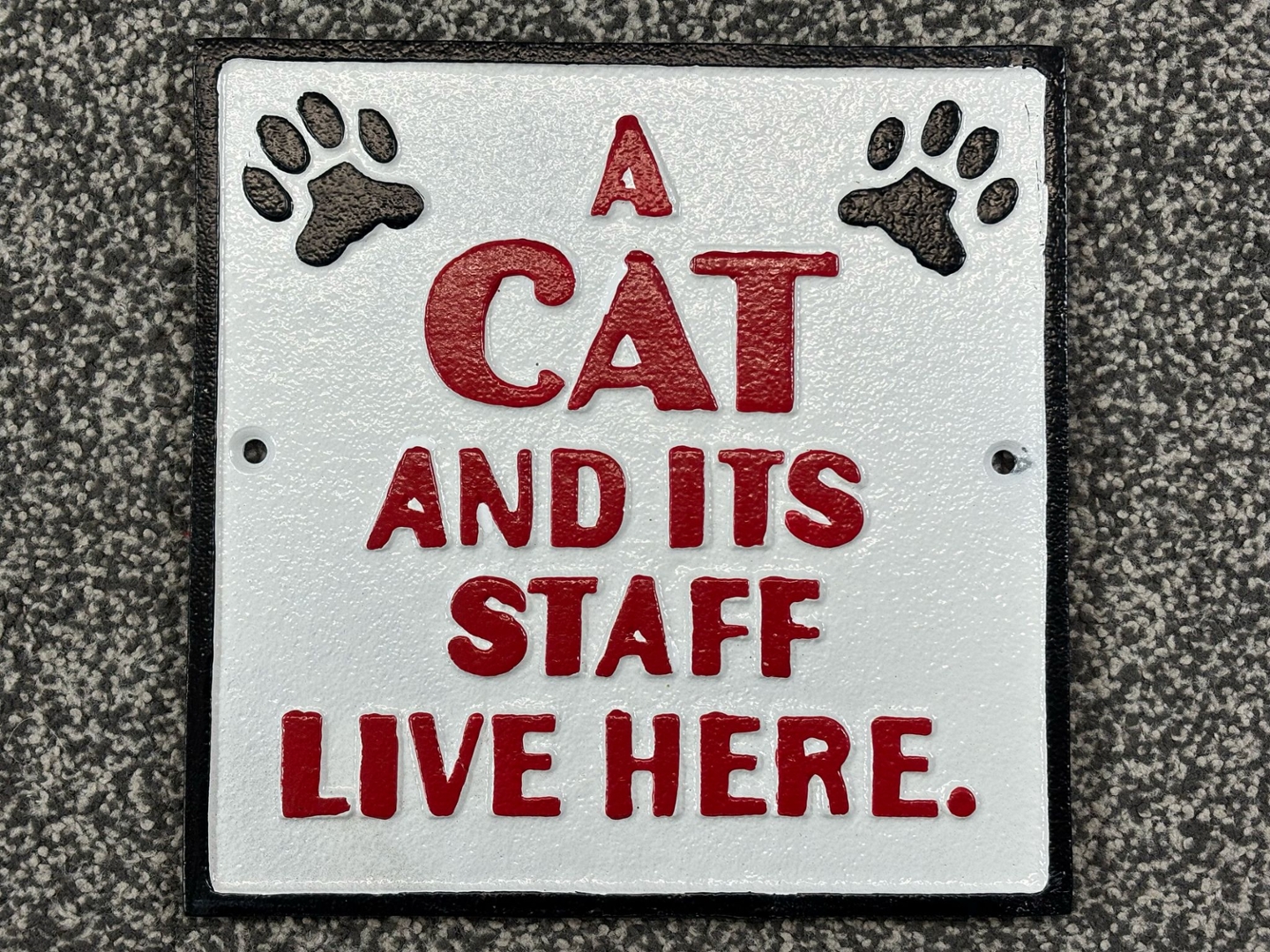 A Cat and Its Staff Live Here wall plaque. Approx 20cm height, 20cm width.