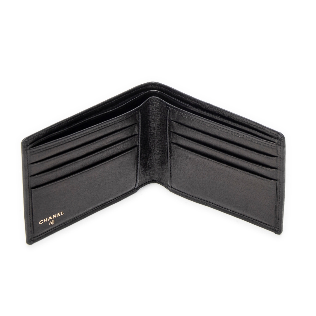 A vintage Chanel black quilted lambskin leather CC Compact Bifold Wallet with a certificate of authenticity, Approximately 9cm height, 11cm width.