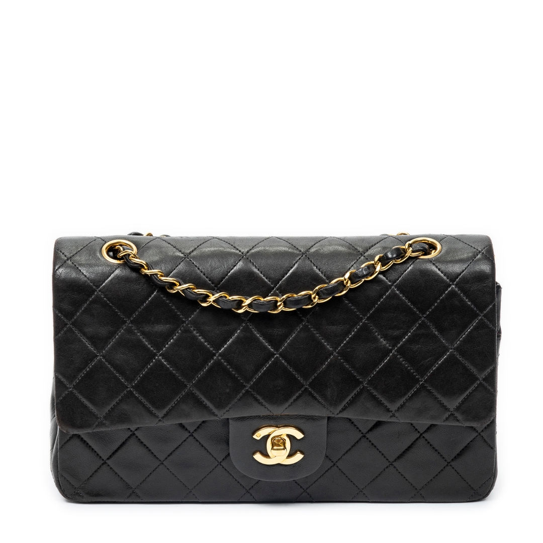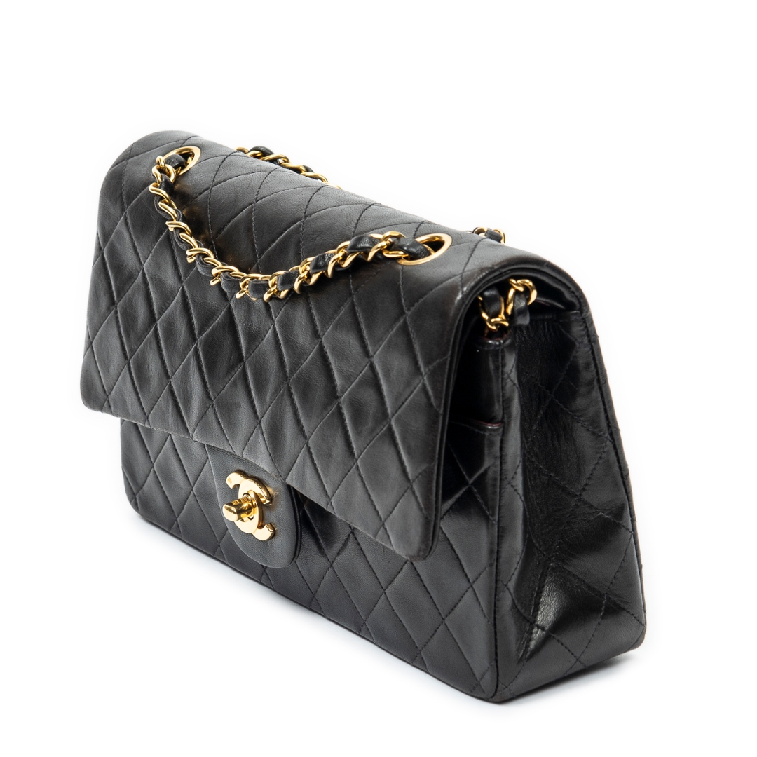 A vintage Chanel black quilted lambskin leather Classic Double Flap bag, an iconic piece that defines timeless luxury and enduring desirability. Crafted from supple lambskin leather, the signature diamond quilting enhances its structured yet elegant silhouette, while the gold-tone CC turn-lock fastening offers an unmistakable hallmark of Chanel’s heritage and craftsmanship.