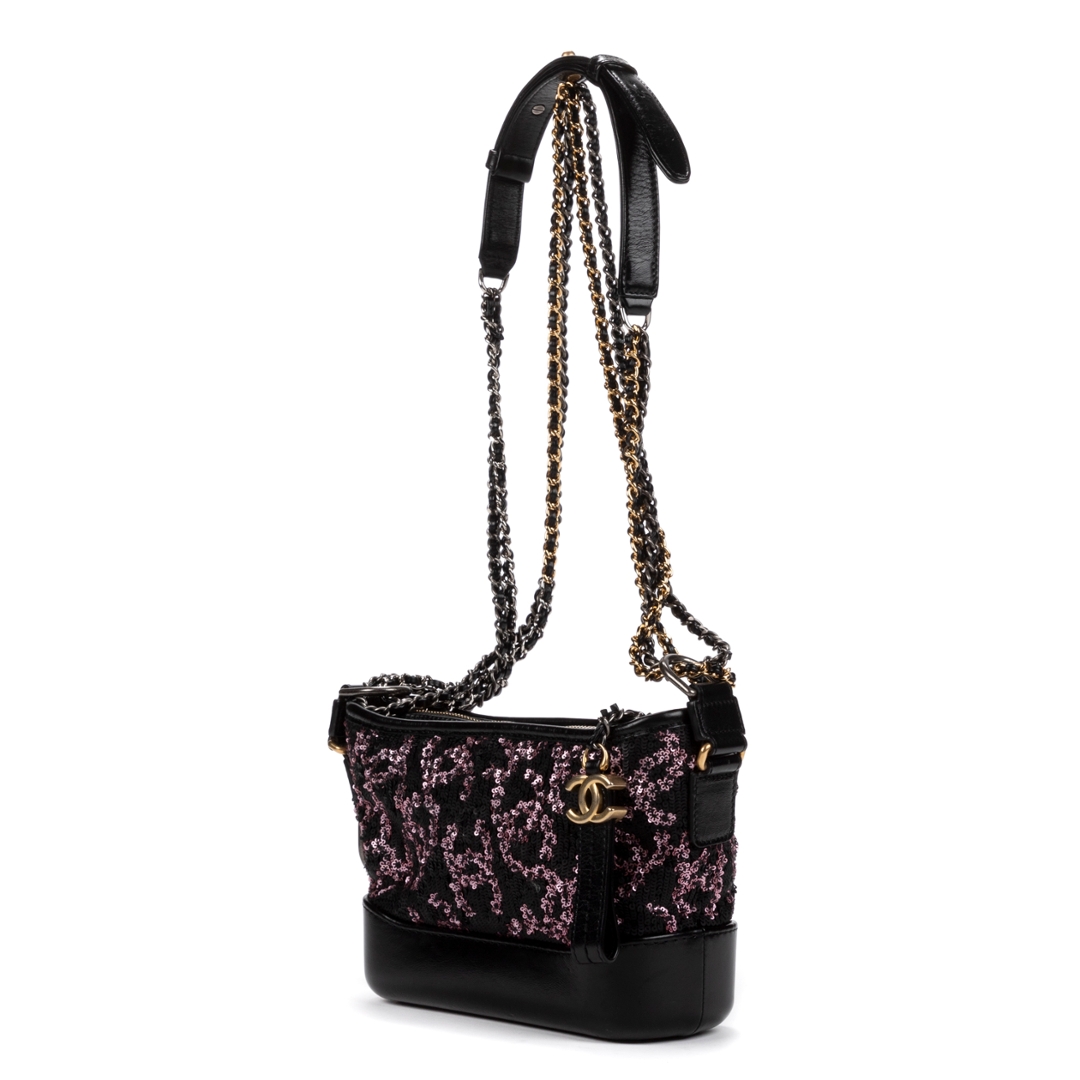 A vintage Chanel Gabrielle Sequins bag, combining black calfskin leather with shimmering sequin canvas for a striking and contemporary interpretation of a classic silhouette. The softly structured body is elevated by the contrast between smooth leather and textured sequins, while the iconic CC charm detail adds a refined and instantly recognisable Chanel signature.
