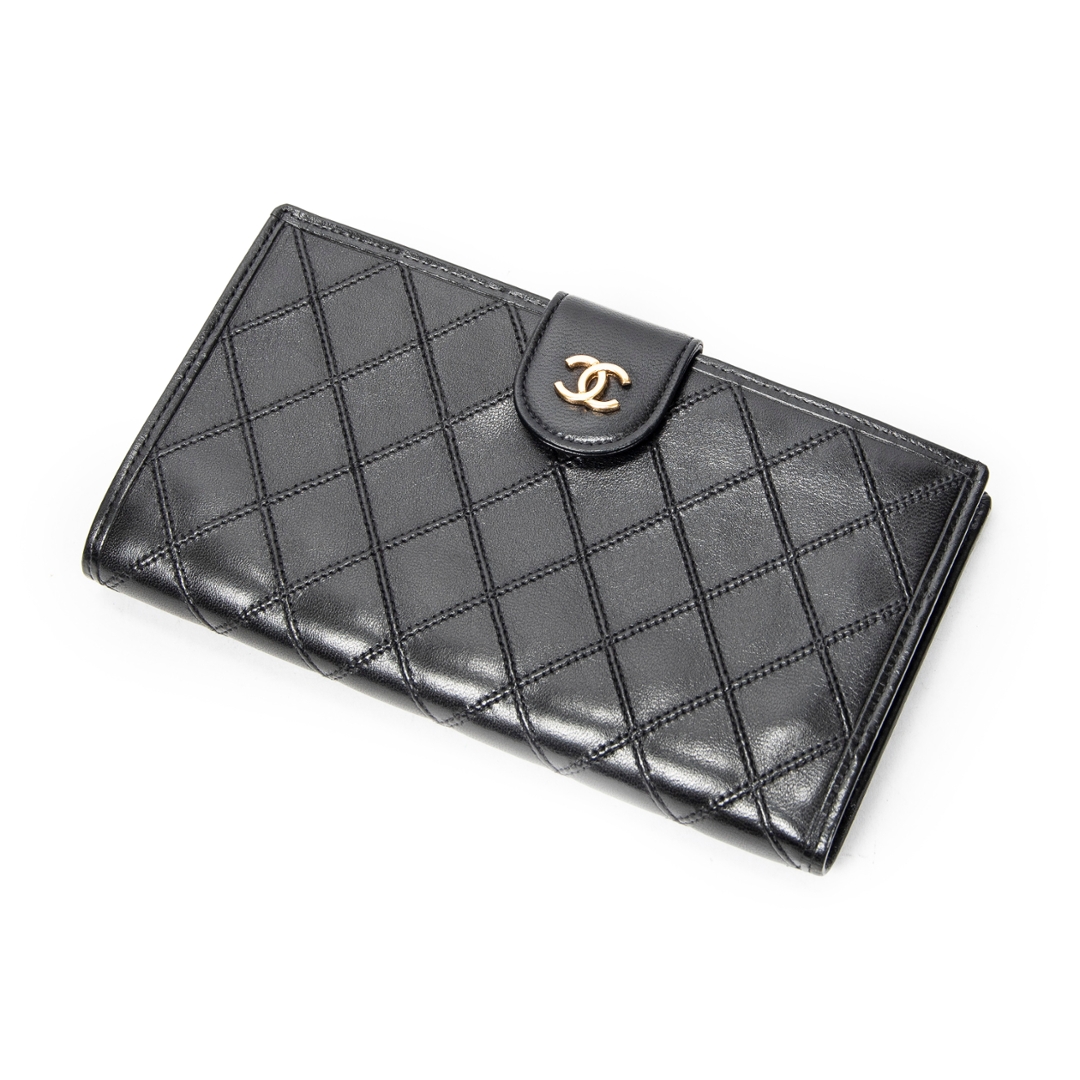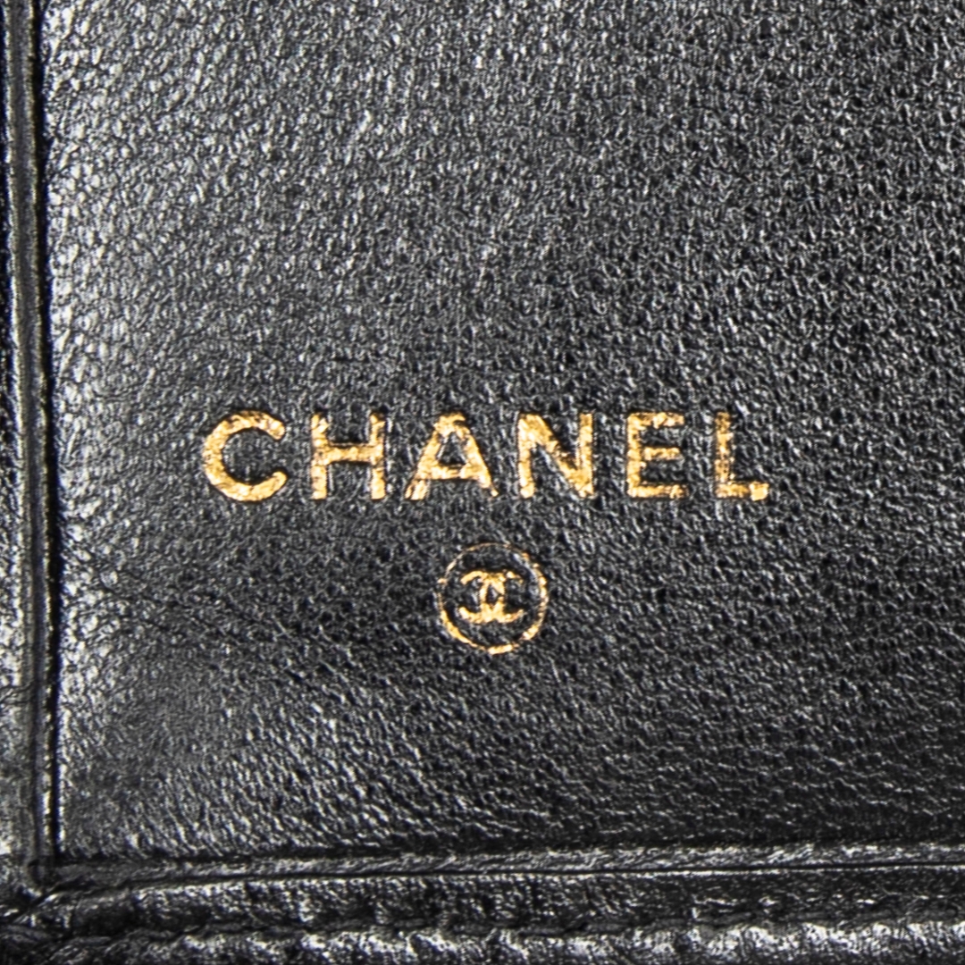 A vintage Chanel black calf leather Long French Purse Wallet bag with a certificate of authenticity, Approximately 10cm height, 18cm width.