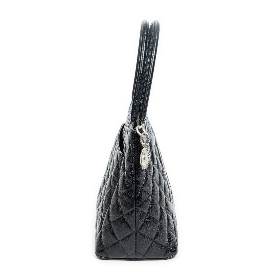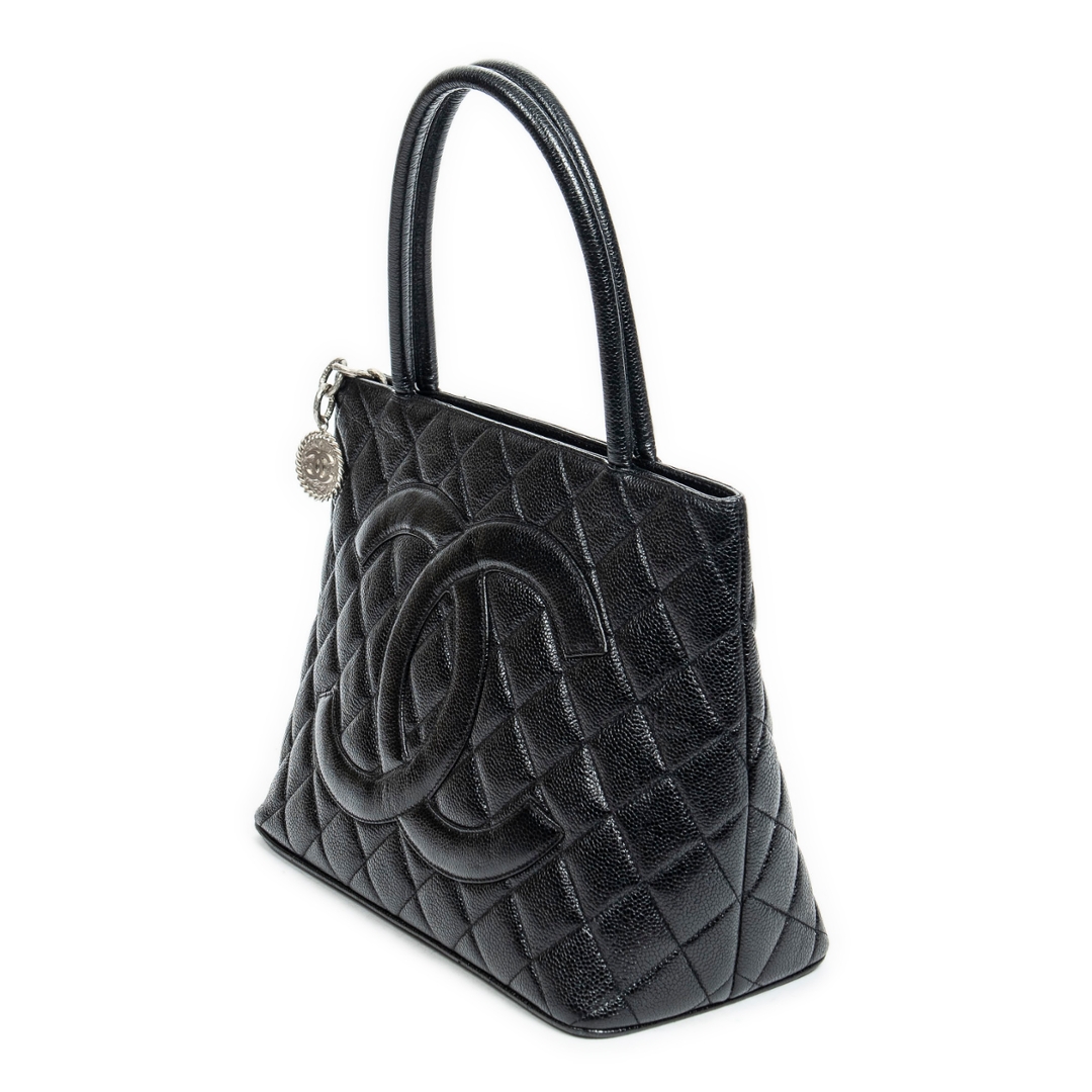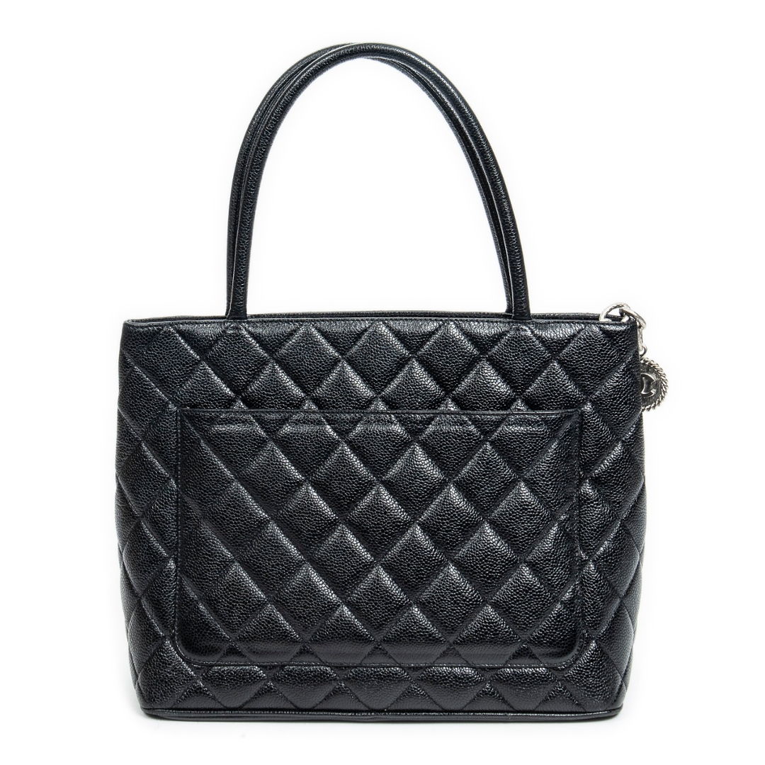 A vintage Chanel black calf leather Medallion Tote bag with a certificate of authenticity, Approximately 25cm height, 30cm width.