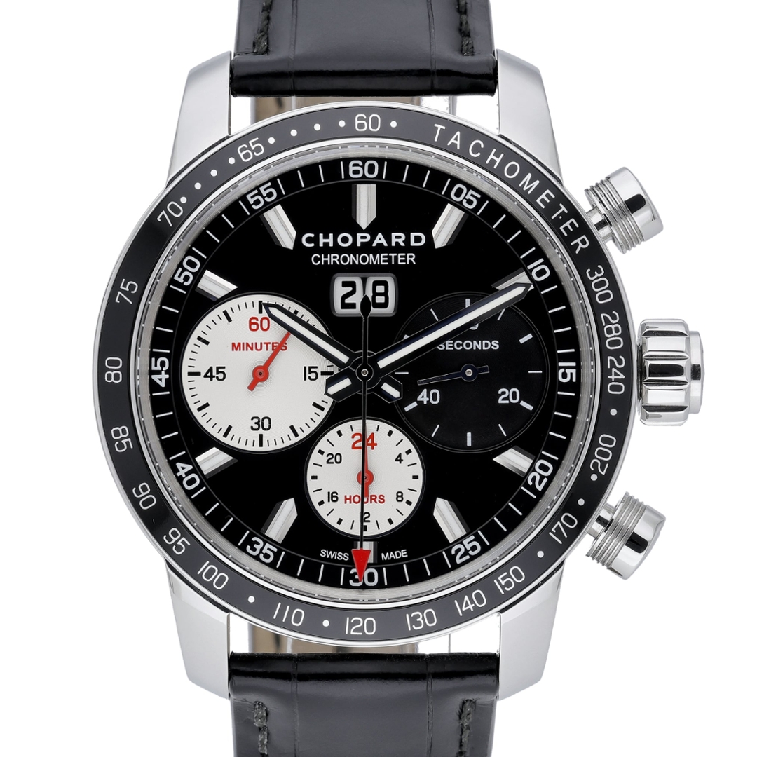 A Chopard Mille Miglia Jacky Ickx Edition V is a purposeful chronograph inspired by classic motorsport, housed in a 42mm stainless steel case with a black tachymeter bezel. The black dial is accented by contrasting silver sub-dials, red chronograph highlights, and a large double date at twelve, delivering excellent legibility and a distinctly sporting character. Applied hour markers and bold hands reinforce its performance-led design.