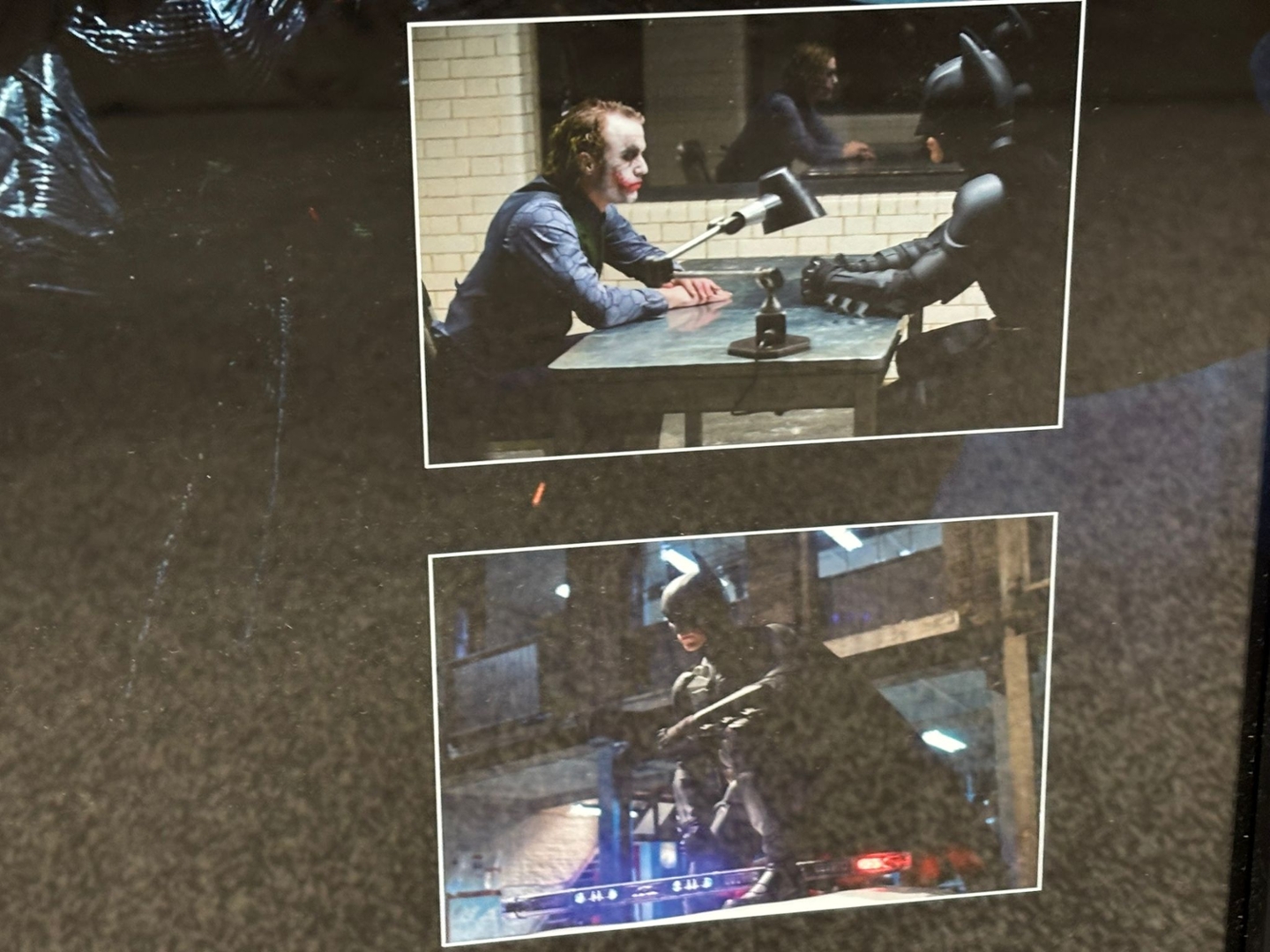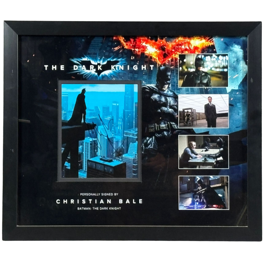 Framed to approximately 56cm in height and 67cm in width, the montage features a striking central image of Batman surveying the Gotham skyline—personally signed by Christian Bale—alongside a dramatic collage of key scenes from the film. From intense confrontations with the Joker to brooding cityscapes and heroic moments, this visually stunning presentation captures the dark intensity and cinematic brilliance of *The Dark Knight*.