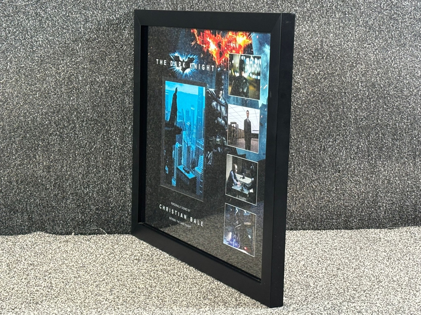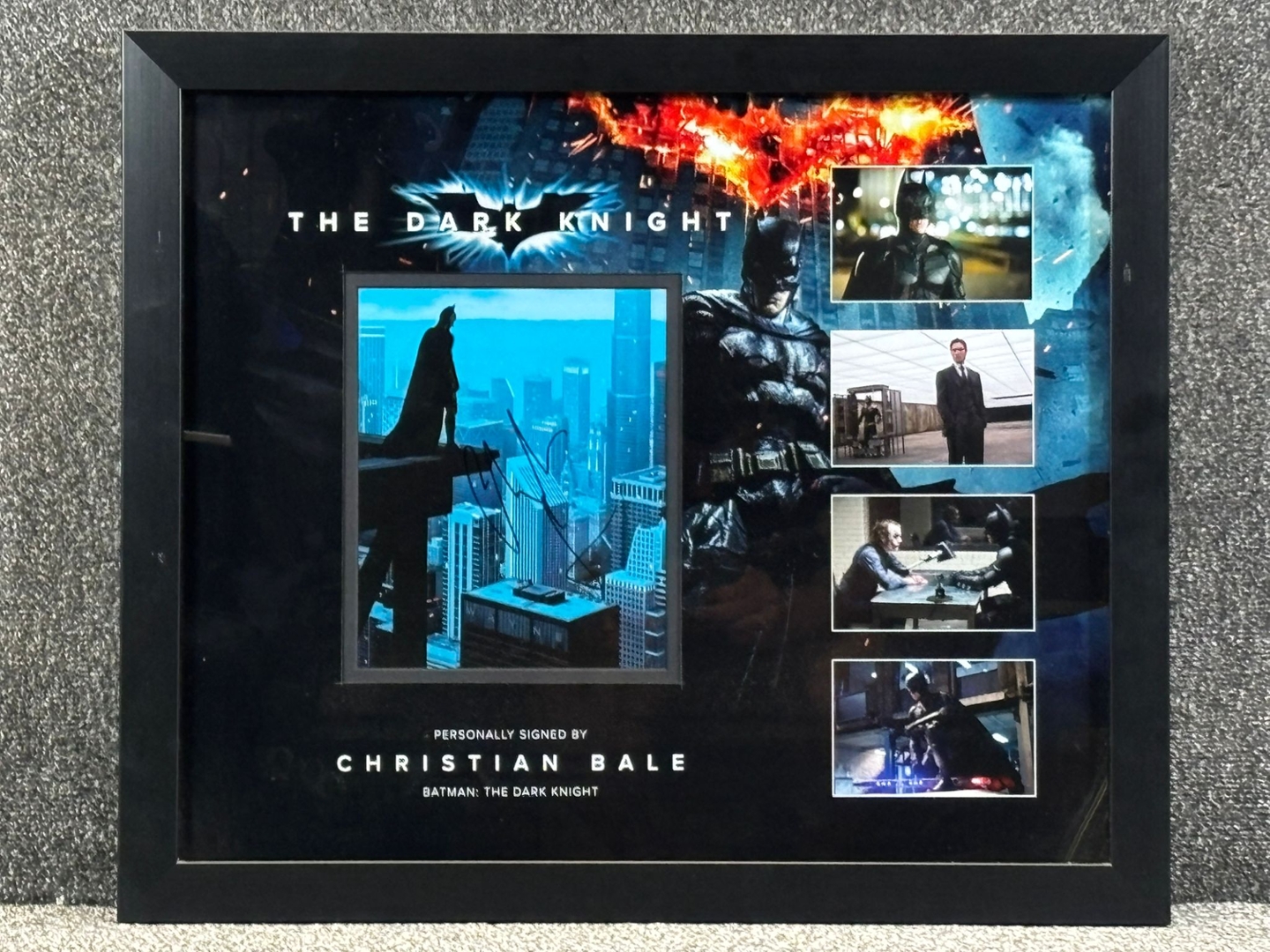 A signed and authenticated Christian Bale The Dark Knight Picture in a presentation frame. Approx 56cm height, 67cm width.