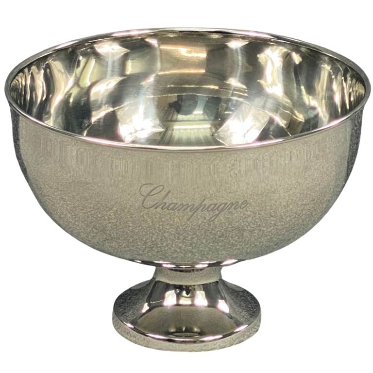 A chrome Champagne cooler, a statement piece that combines style with functionality. Standing approximately 9 inches in height and boasting a width of 12 inches, this cooler is designed to keep your bubbly perfectly chilled while adding a touch of elegance to any table setting.