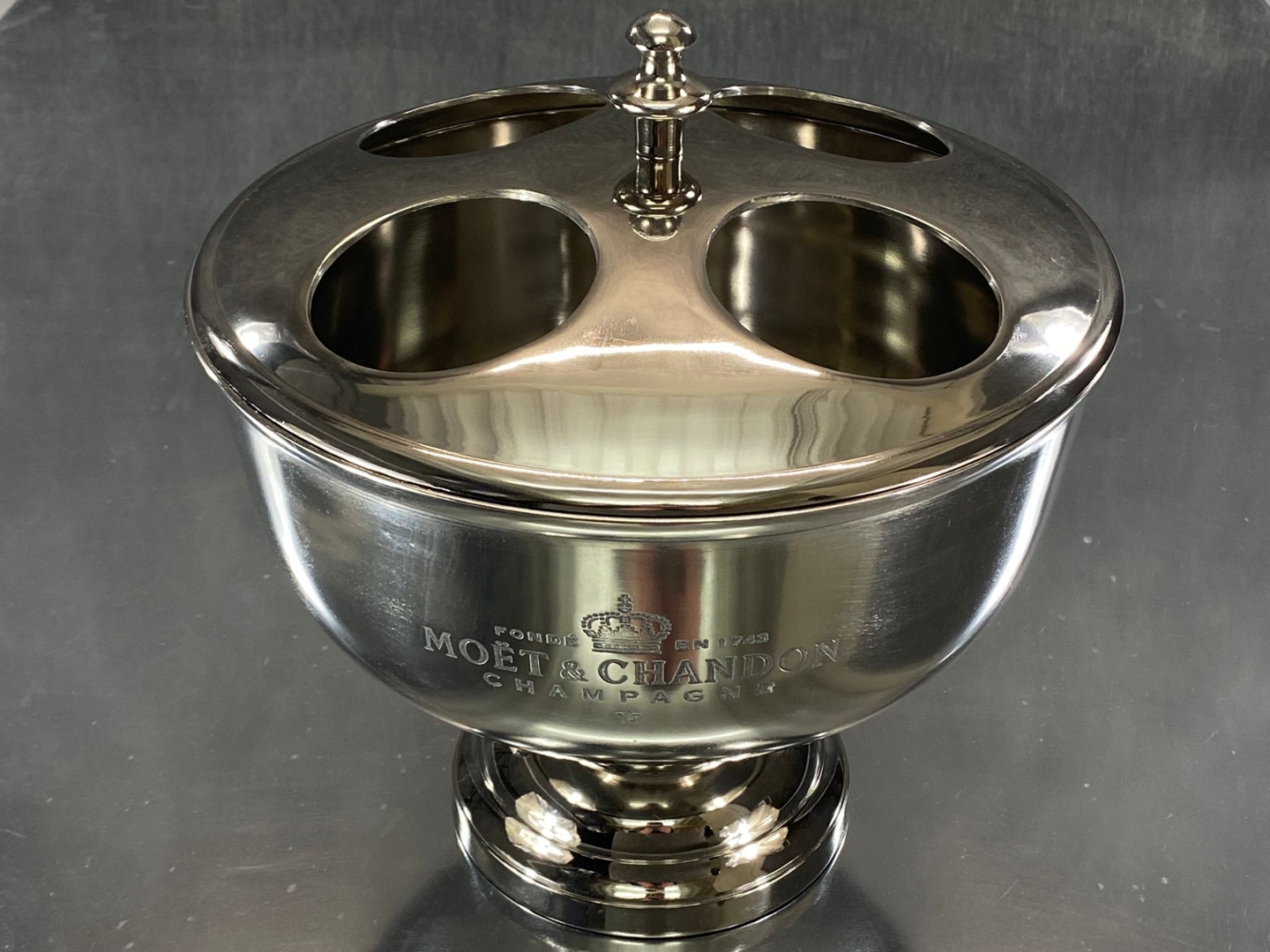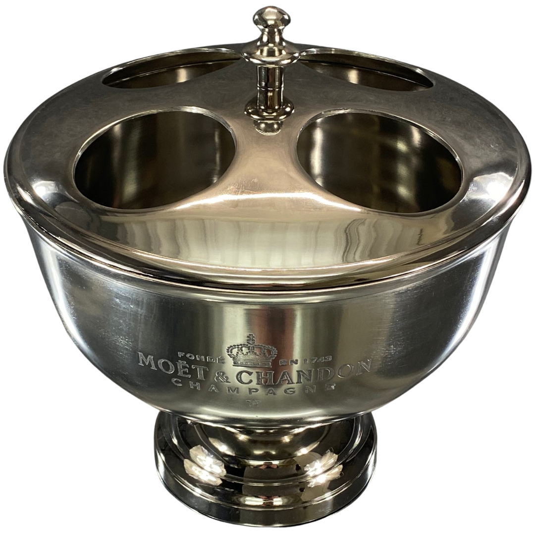 Whether used for entertaining guests at home, in a restaurant, or at a special event, the chrome four-bottle Moet & Chandon design Champagne cooler adds a touch of luxury and refinement to any occasion. Its stylish appearance and functional design make it a must-have accessory for anyone who appreciates fine wine and Champagne.