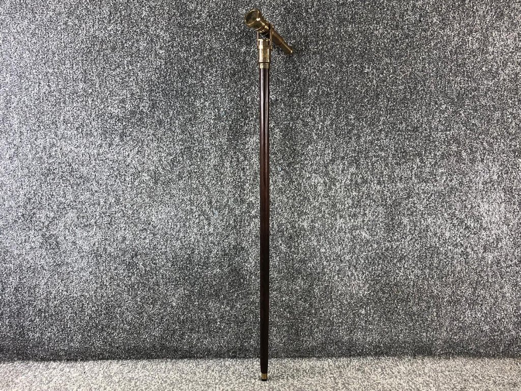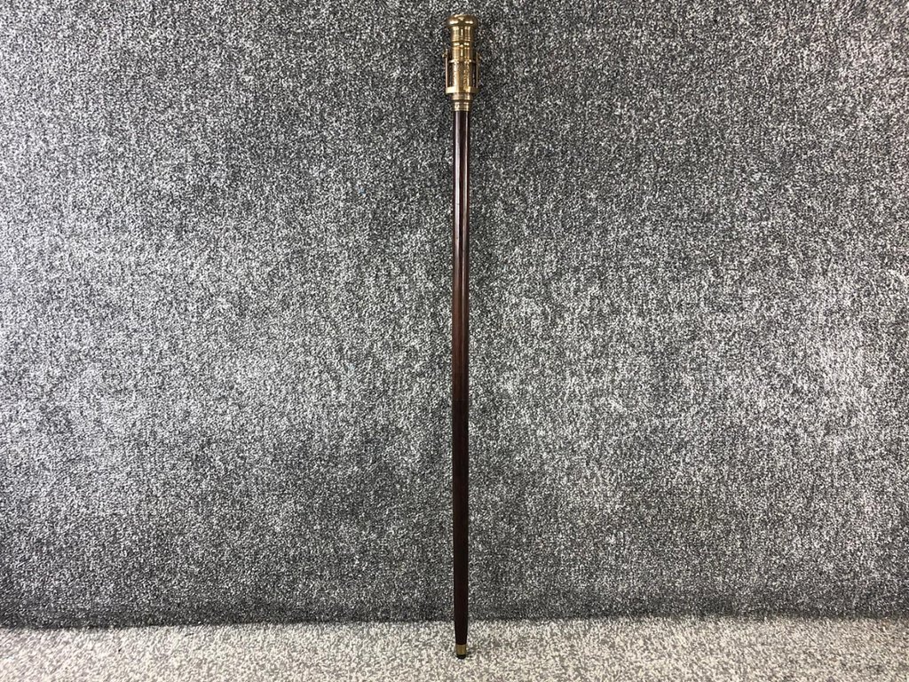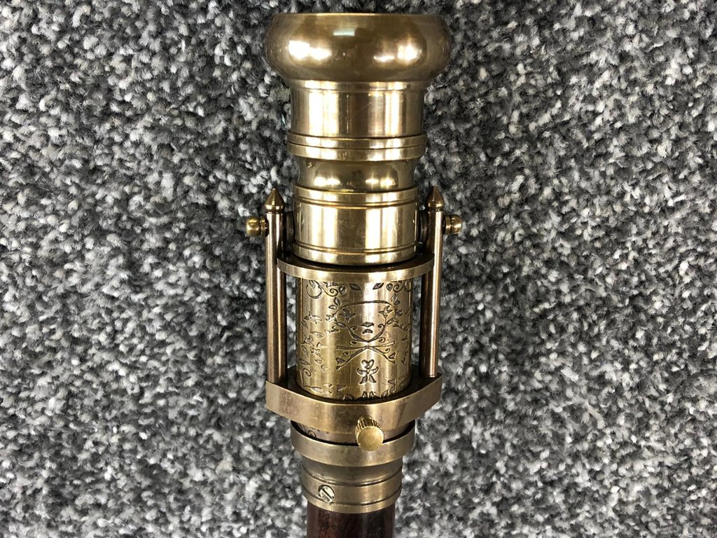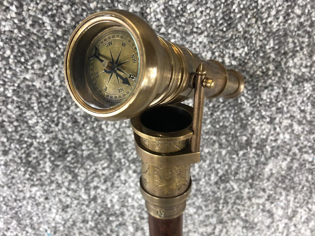 A brass & wooden Compass & Hidden Telescope walking stick. Approx 37" height, 2" width.