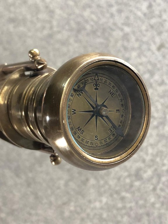 Crafted from the finest brass and wood, the walking stick exudes timeless sophistication, with intricate detailing and a polished finish that catches the eye. At its apex rests a brass compass, a symbol of direction and guidance, while discreetly concealed within the shaft lies a remarkable telescope, ready to unveil distant vistas and celestial wonders at a moment's notice.