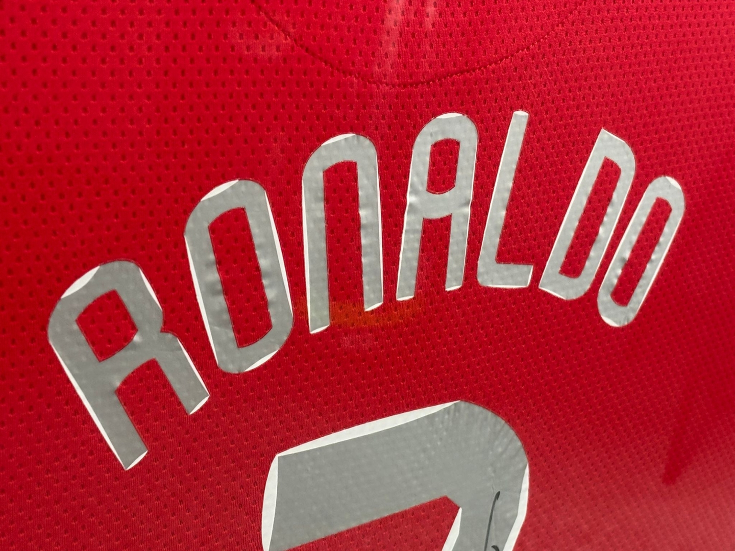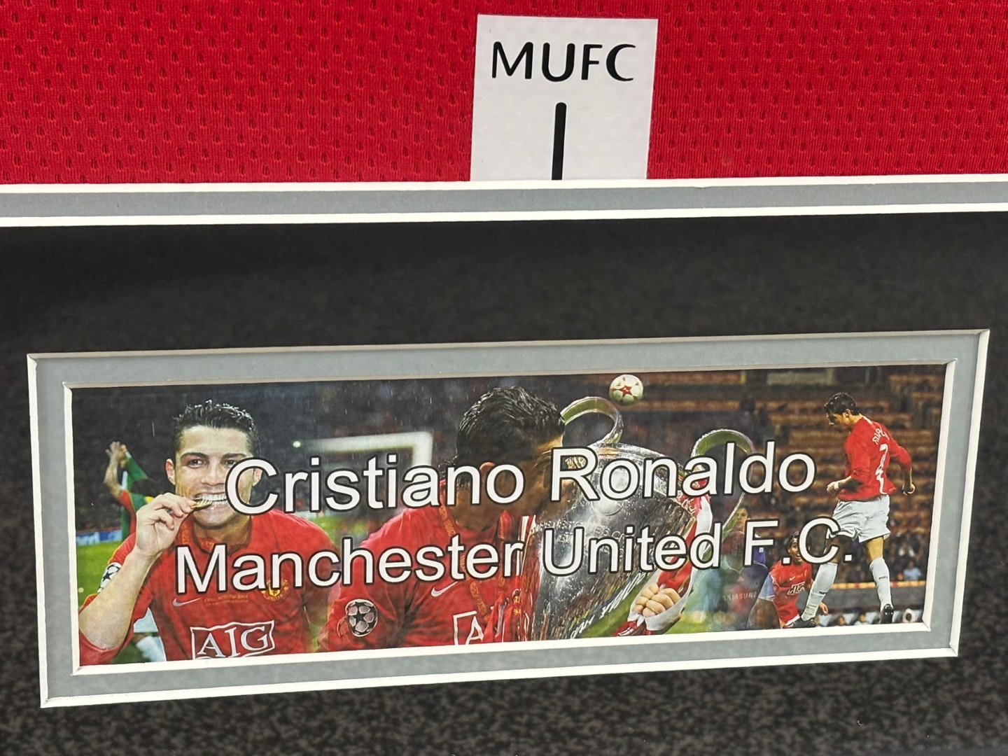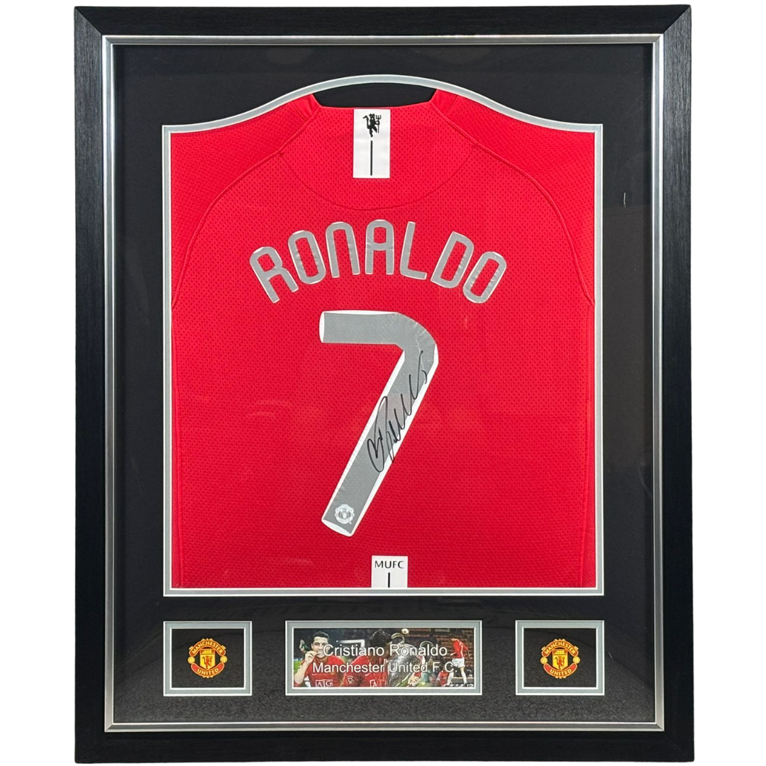 The display measures approximately 83cm in height and 68cm in width, finished in a sleek black frame with silver trim to complement the famous red shirt. Professionally mounted, it also includes official Manchester United crests and a descriptive plaque with an action image of Ronaldo, capturing the magic of his time at Old Trafford.