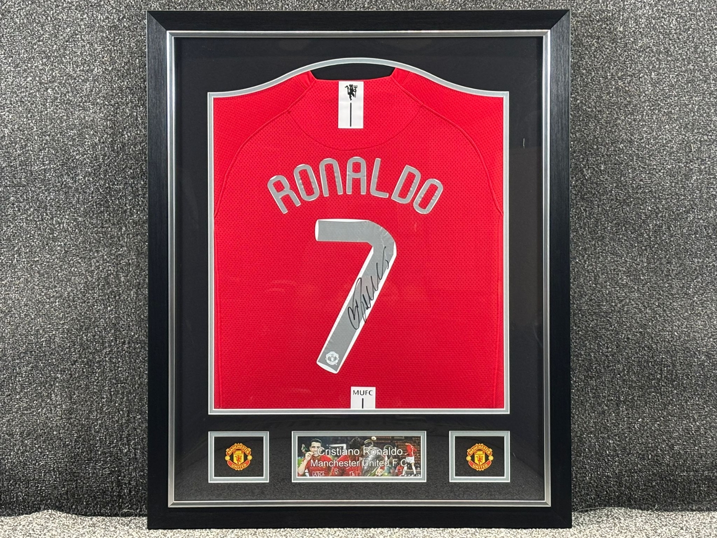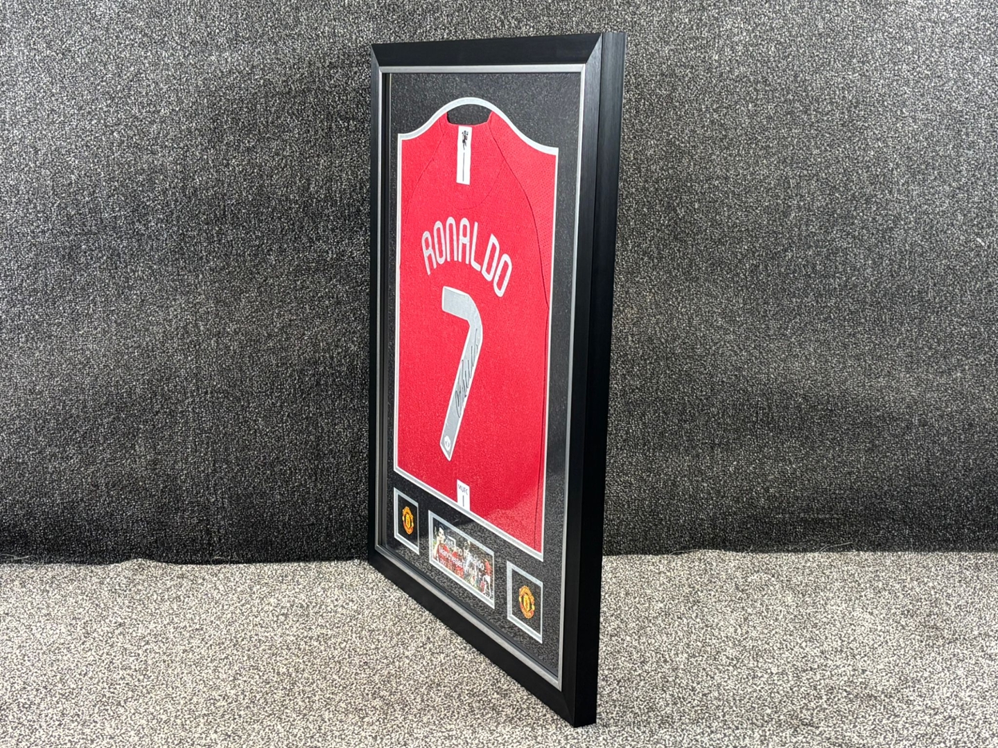 A signed and authenticated Cristiano Ronaldo Man United Shirt in a presentation frame. Approx 83cm height, 68cm width.