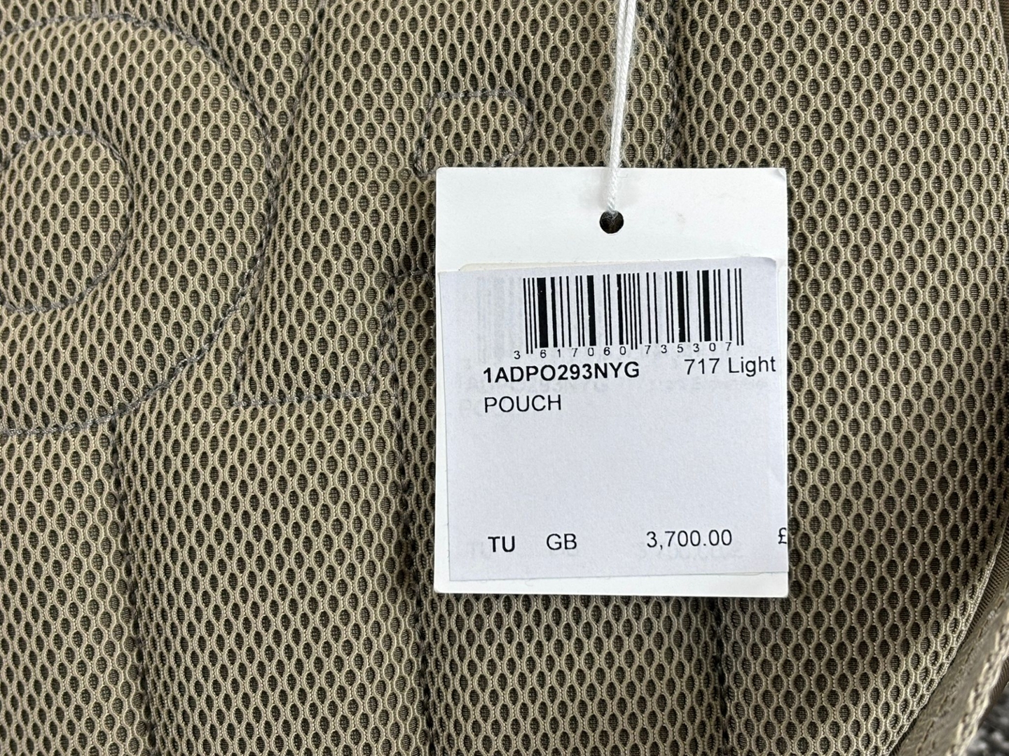 A Dior beige technical fabric saddle bag, reimagining the house’s iconic silhouette with a contemporary, sport-inspired aesthetic. The combination of structured leather panels and breathable mesh inserts creates a layered, textured look, while the standout geometric overlay adds a bold, architectural element across the front. Finished with subtle Dior branding, the design delivers a modern and distinctive take on a classic style.