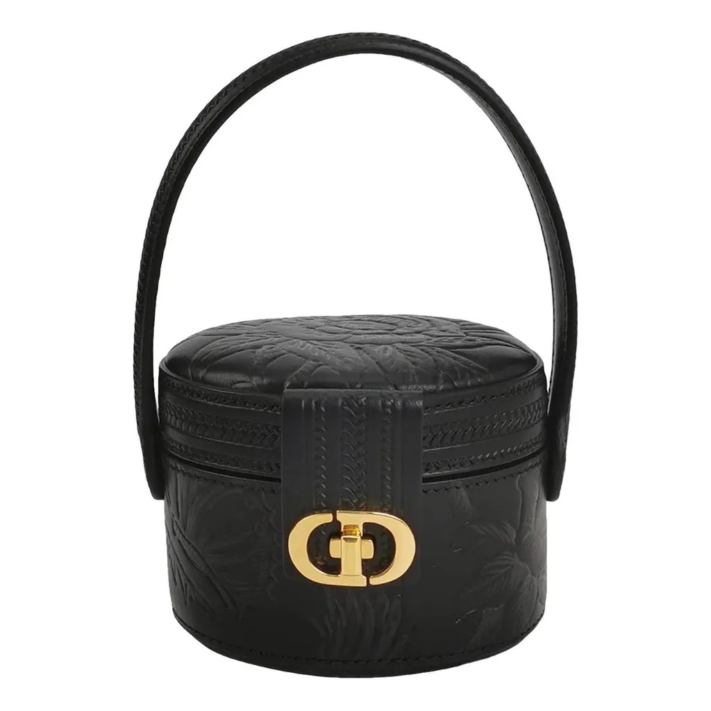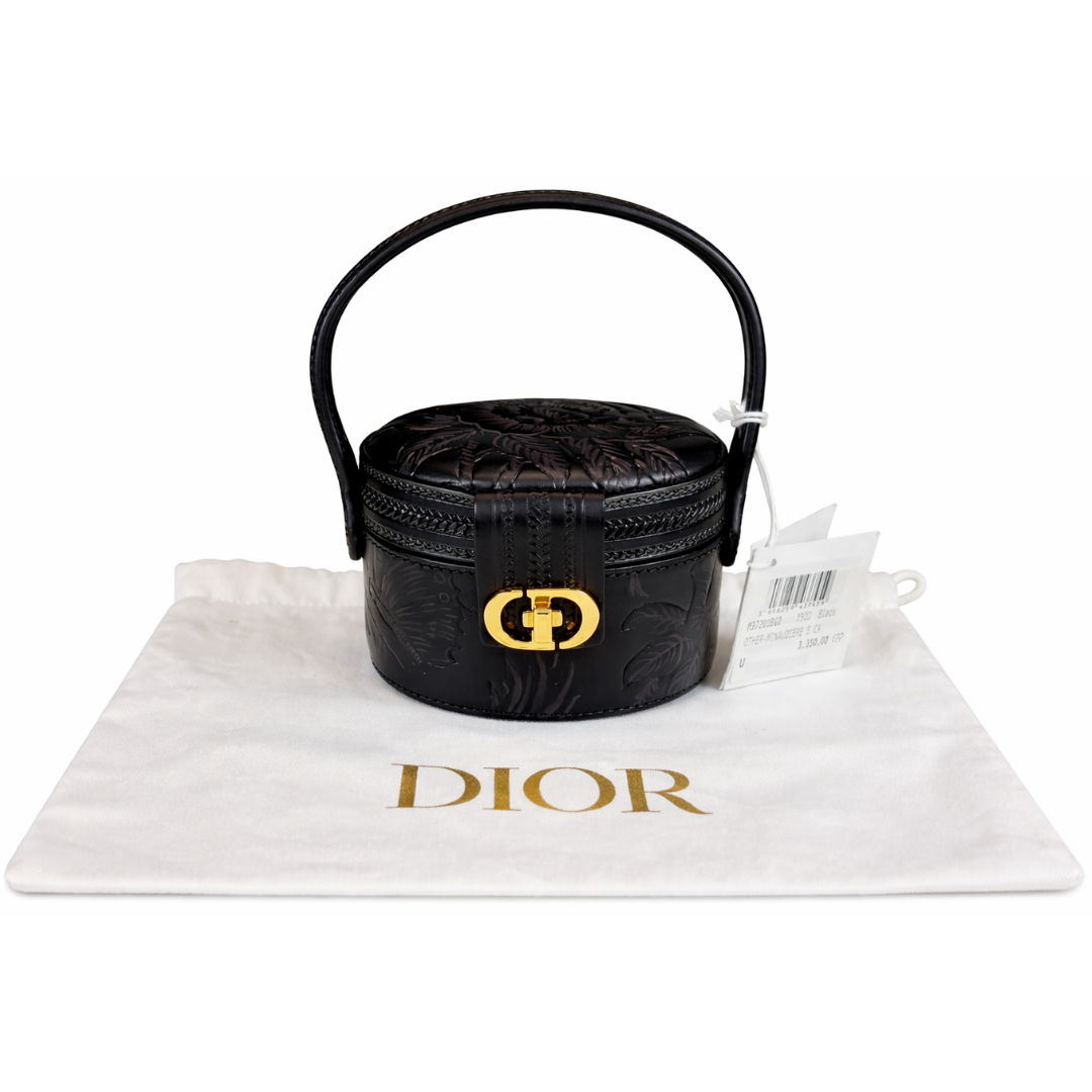 A Dior black embossed leather mini vanity case, crafted in a structured, rounded silhouette that delivers both elegance and statement appeal. The intricate embossed pattern subtly enhances the leather, creating depth and texture, while the gold-tone CD clasp at the front provides a striking focal point and unmistakable signature finish. A curved top handle completes the design, adding a refined and distinctive touch.