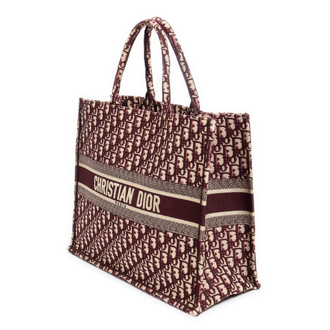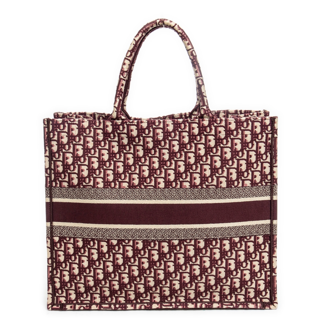 A vintage burgundy and baige canvas Dior Book Tote bag with a certificate of authenticity, Approximately 36cm height, 41cm width.