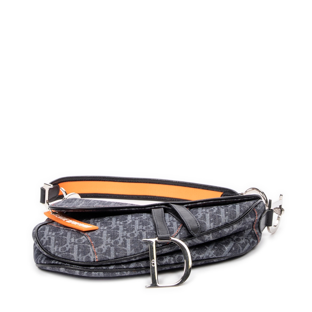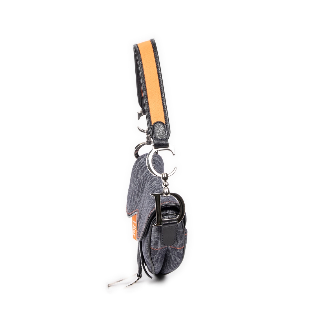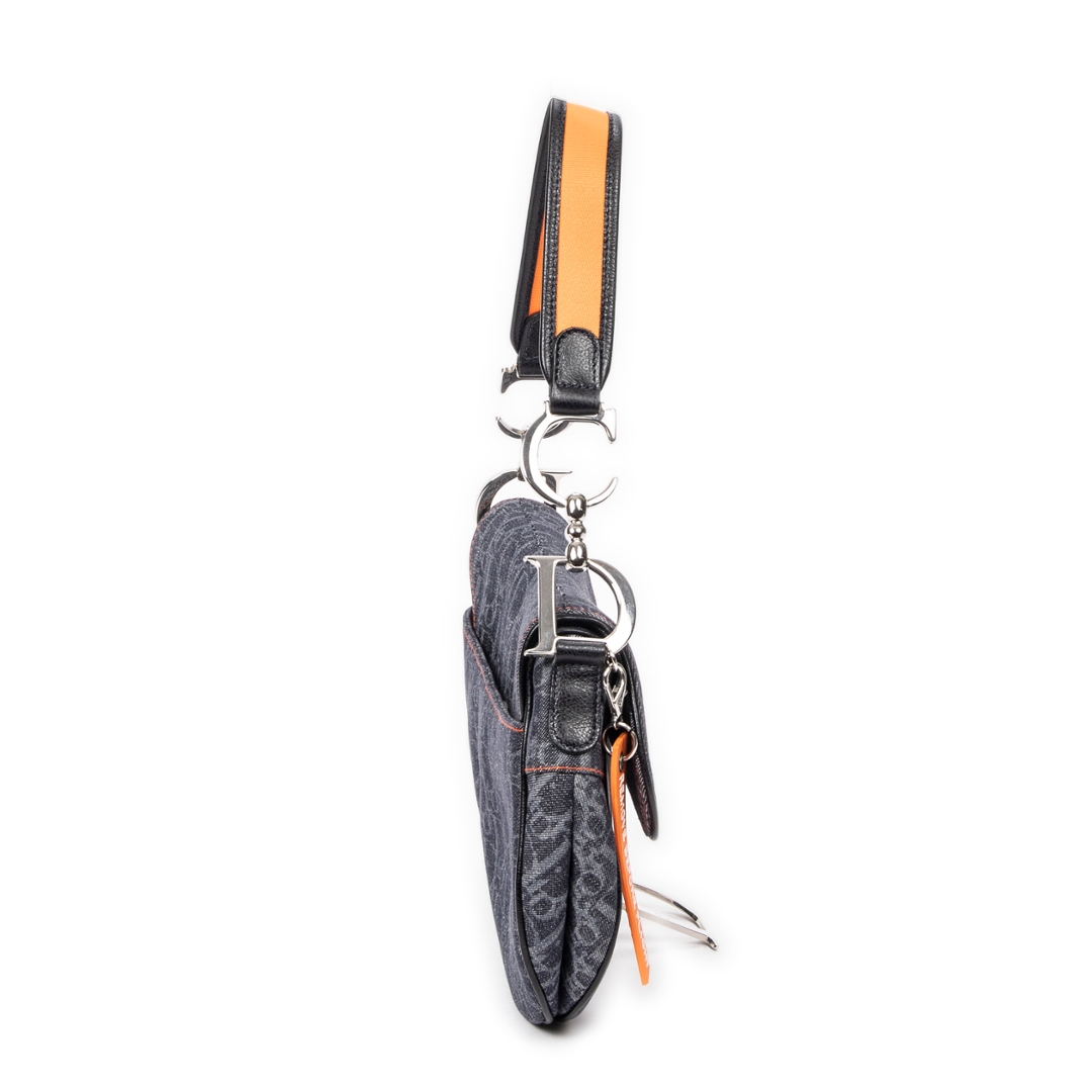 A vintage denim blue canvas Dior Flight Saddle bag — a bold reinterpretation of one of Dior’s most iconic silhouettes, blending heritage craftsmanship with a modern, street-inspired edge. Crafted from durable denim blue canvas, the bag features the instantly recognisable Dior monogram pattern, contrasted beautifully with orange leather accents for a striking, contemporary finish.