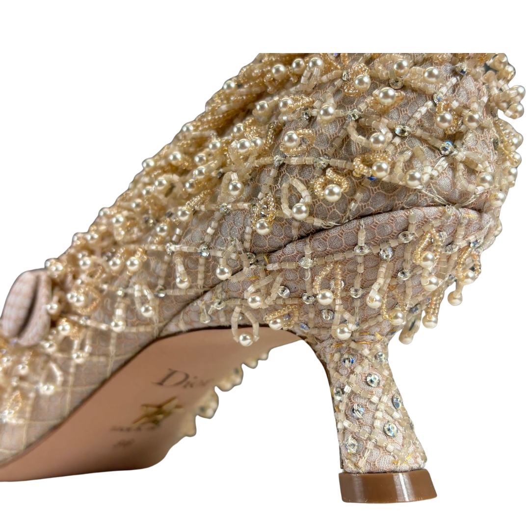 A Dior Haute Couture nude embellished mesh pumps, showcasing exceptional craftsmanship and intricate detailing synonymous with the house’s most exclusive creations. The delicate mesh upper is richly adorned with hand-applied pearls, beads, and embroidery, creating a textured, dimensional finish that catches the light beautifully. The elegant silhouette is further enhanced by a refined strap detail, adding both structure and a graceful, feminine touch.