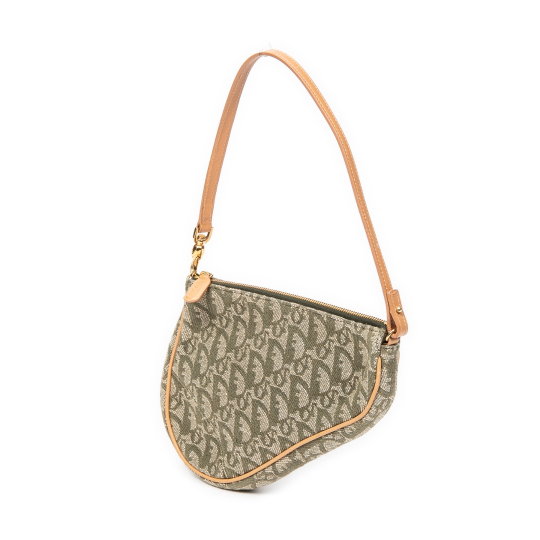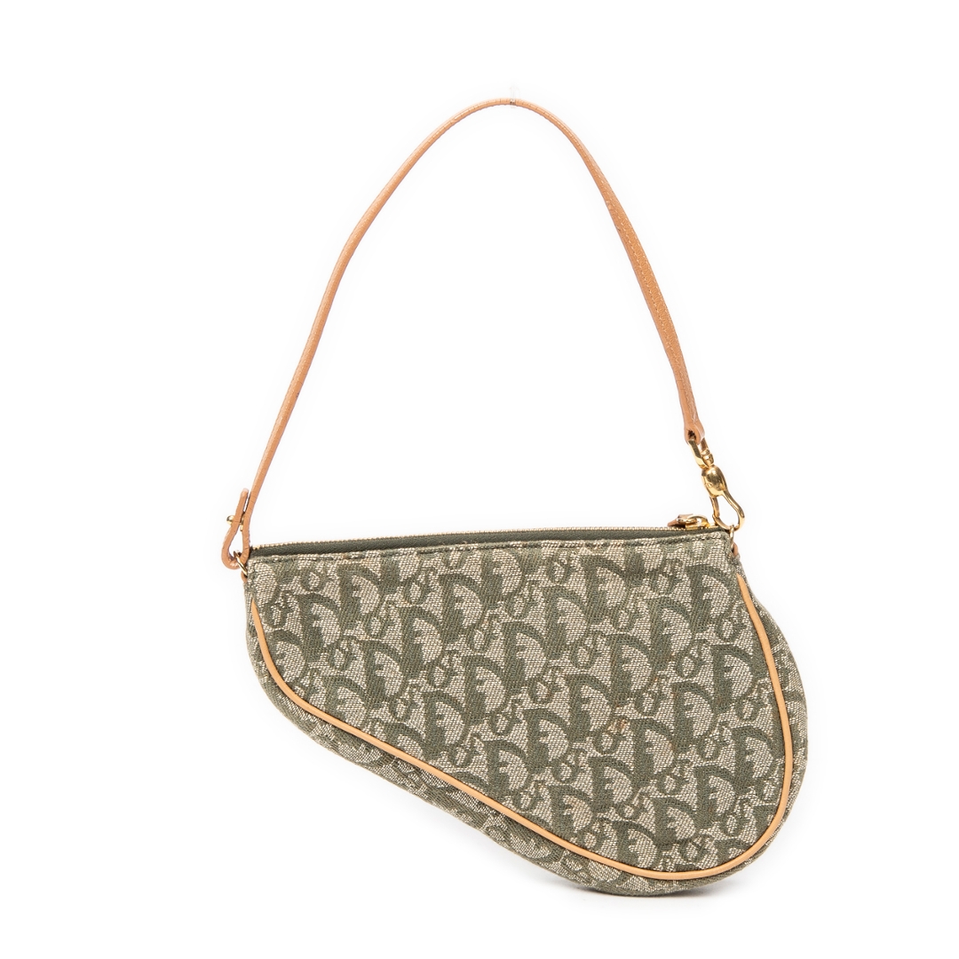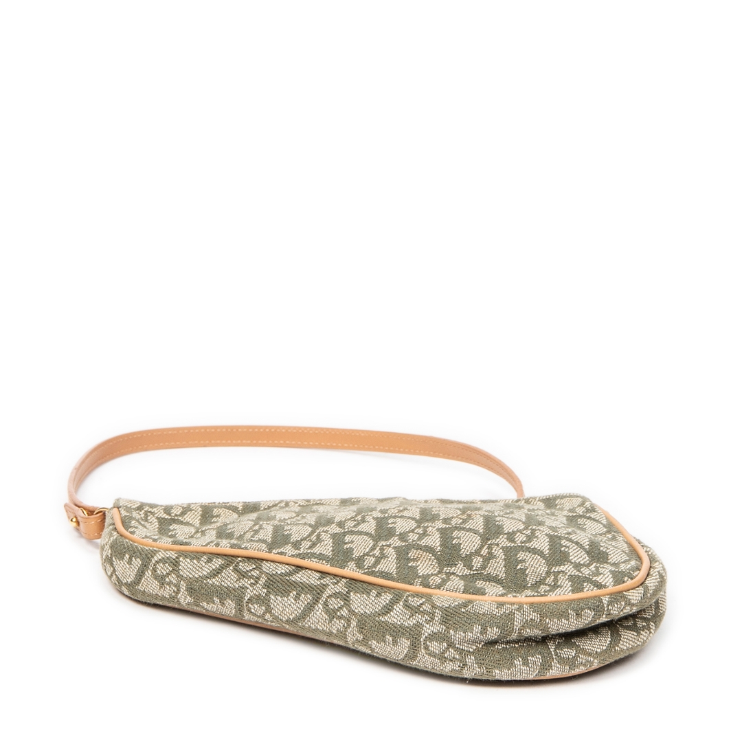 A vintage Dior green/beige canvas Mini Saddle Pochette bag with a certificate of authenticity. Approximately 16cm height, 20cm width.
